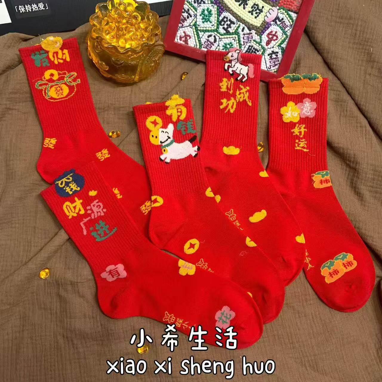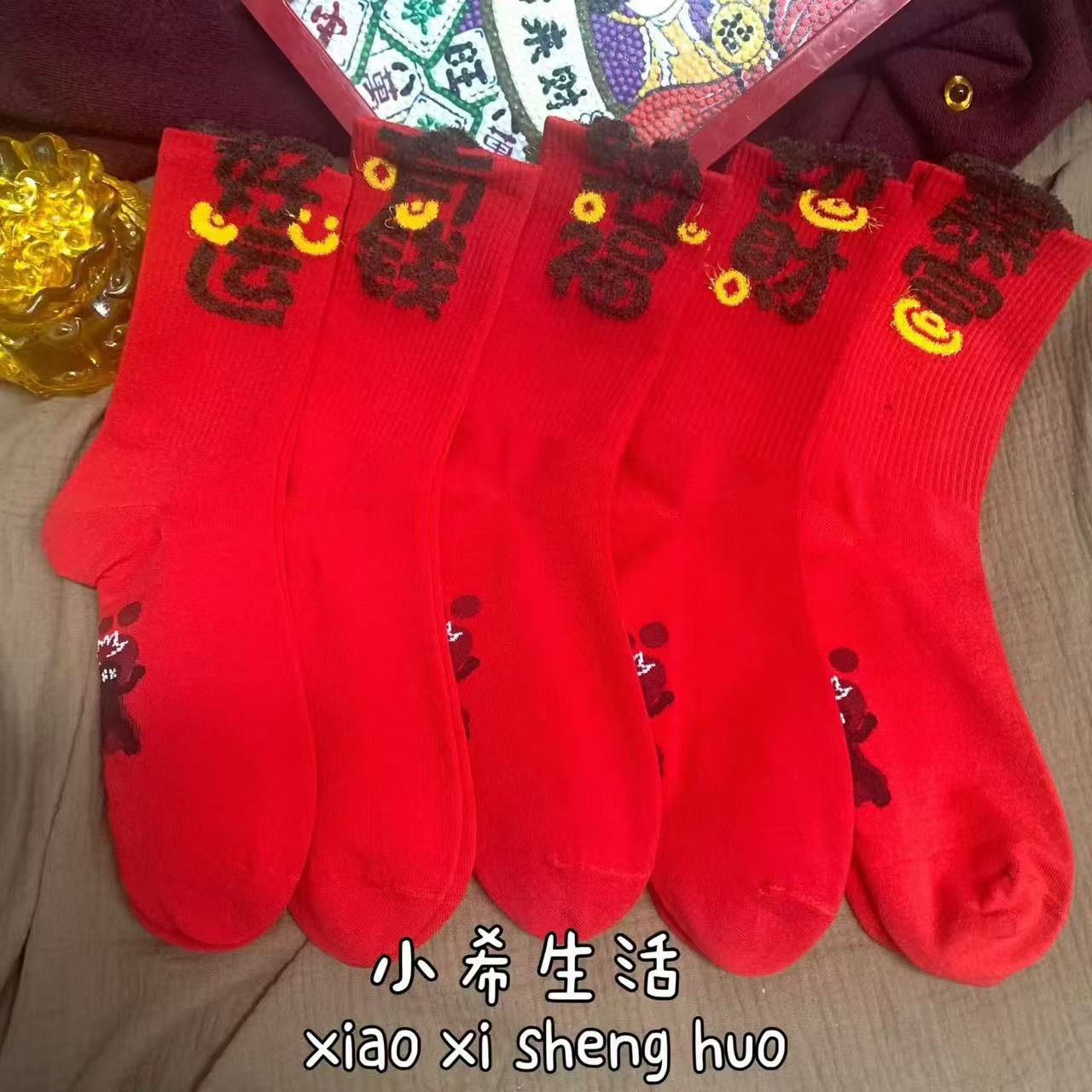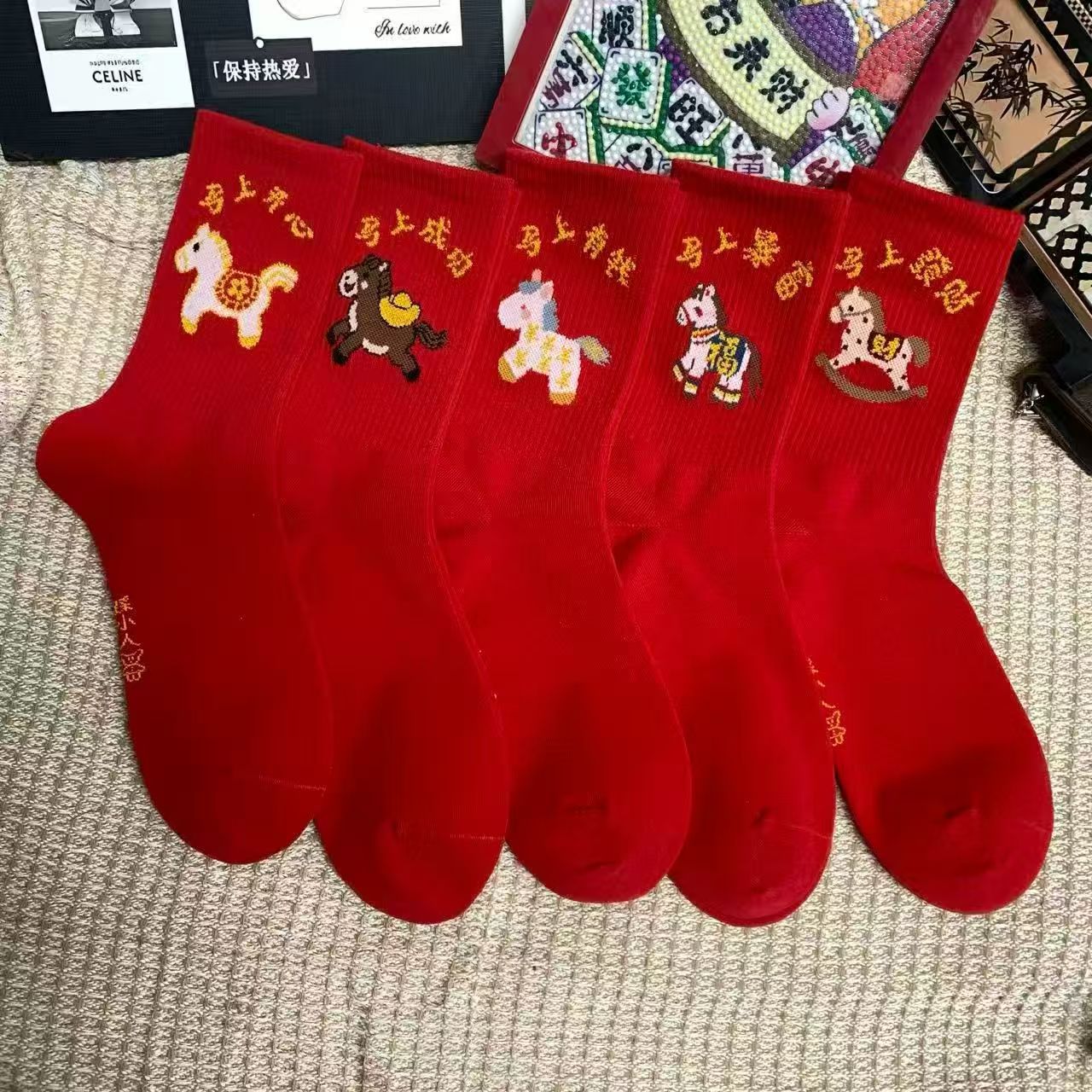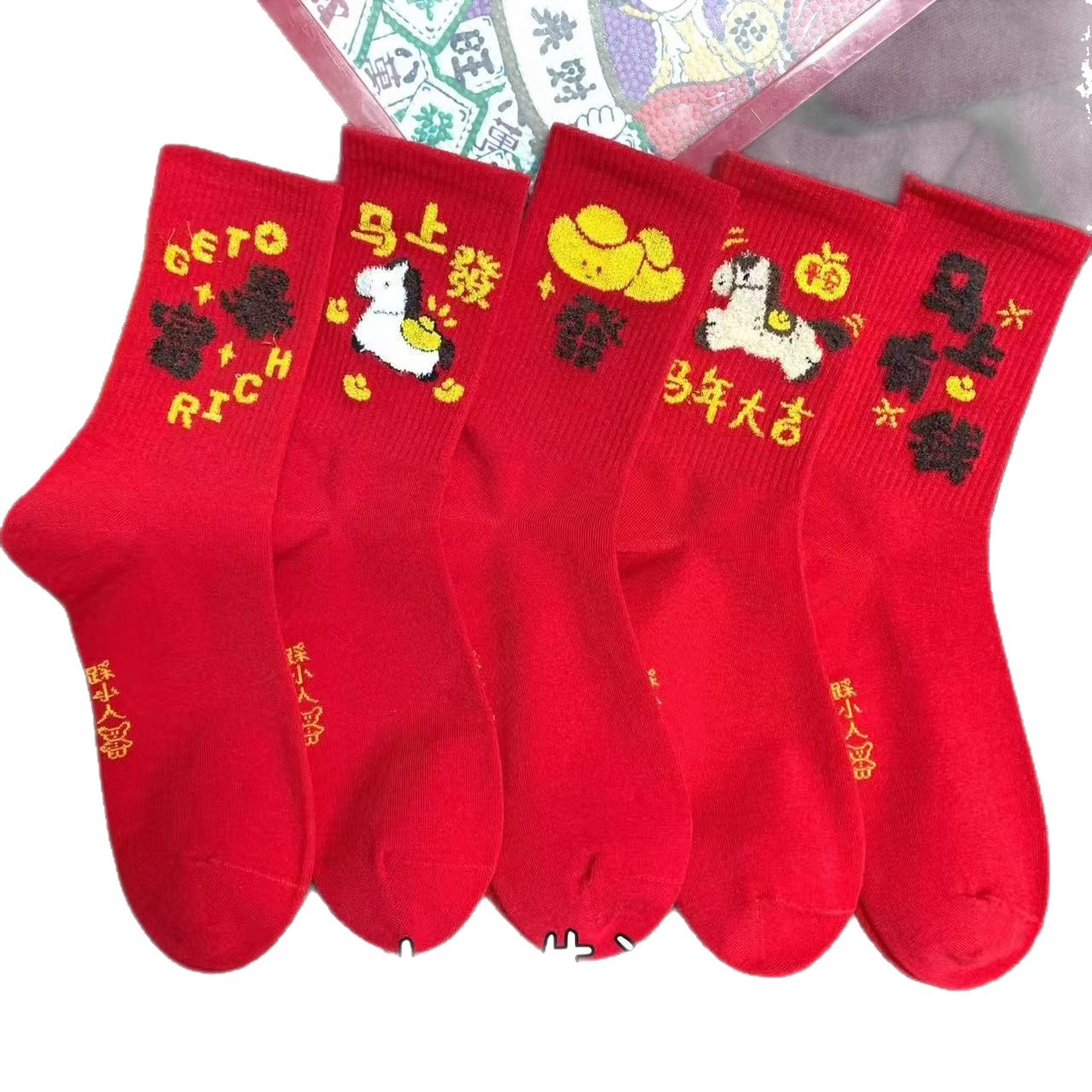 2026年新款男女大红袜马年新年中筒袜秋冬保暖袜喜庆文字创意棉袜