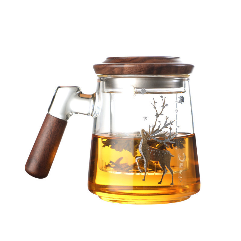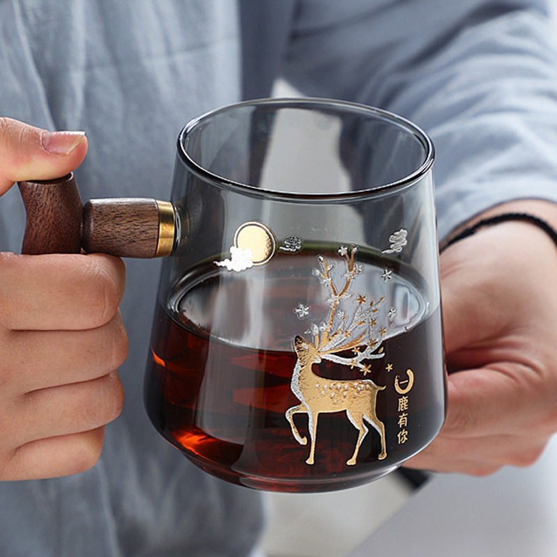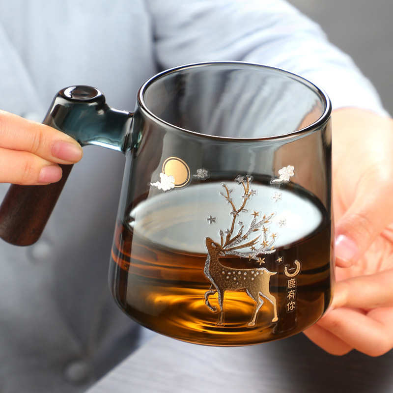 批发木把杯高硼硅三件杯一路有你翘把泡茶杯带盖花茶杯家用办公杯