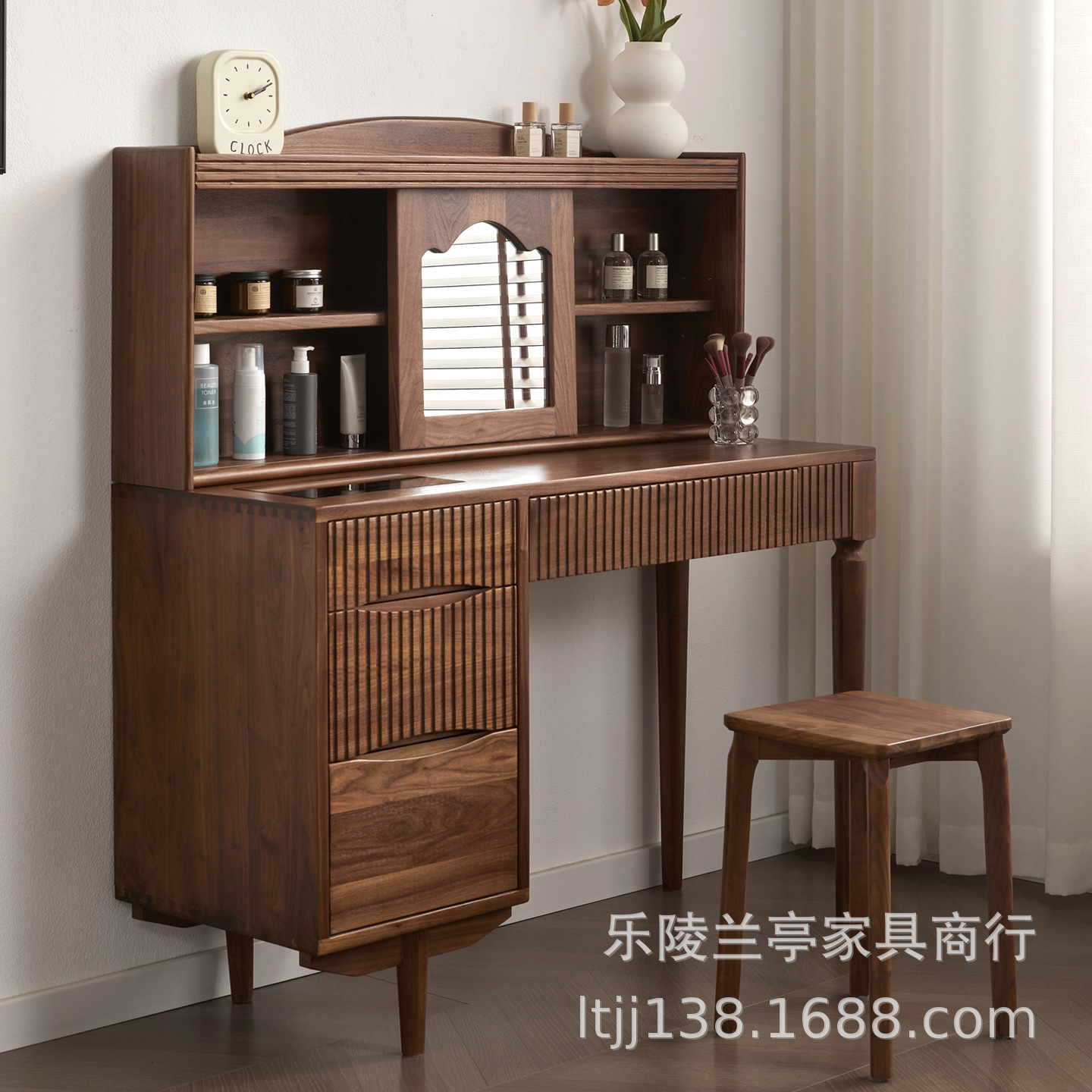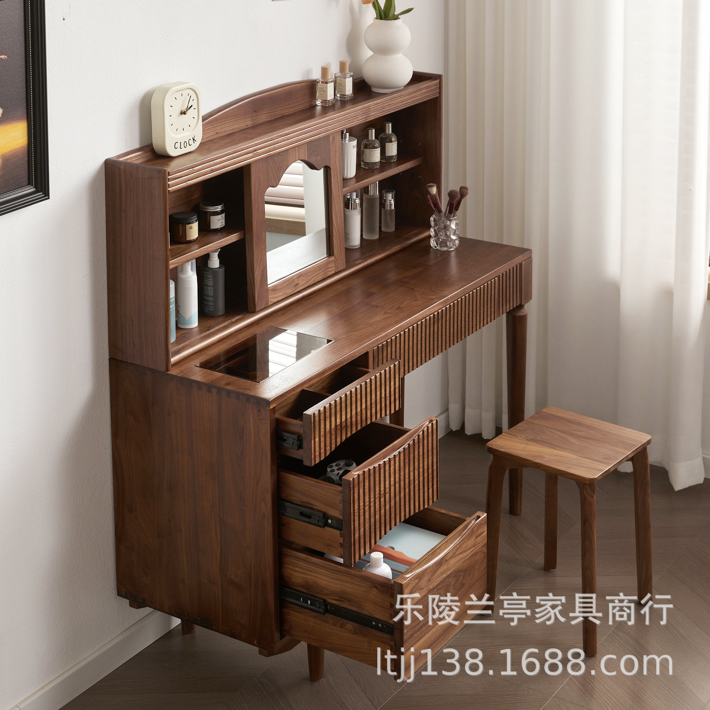 北美黑胡桃木梳妆台北欧简约实木化妆桌小户型卧室多功能化妆台