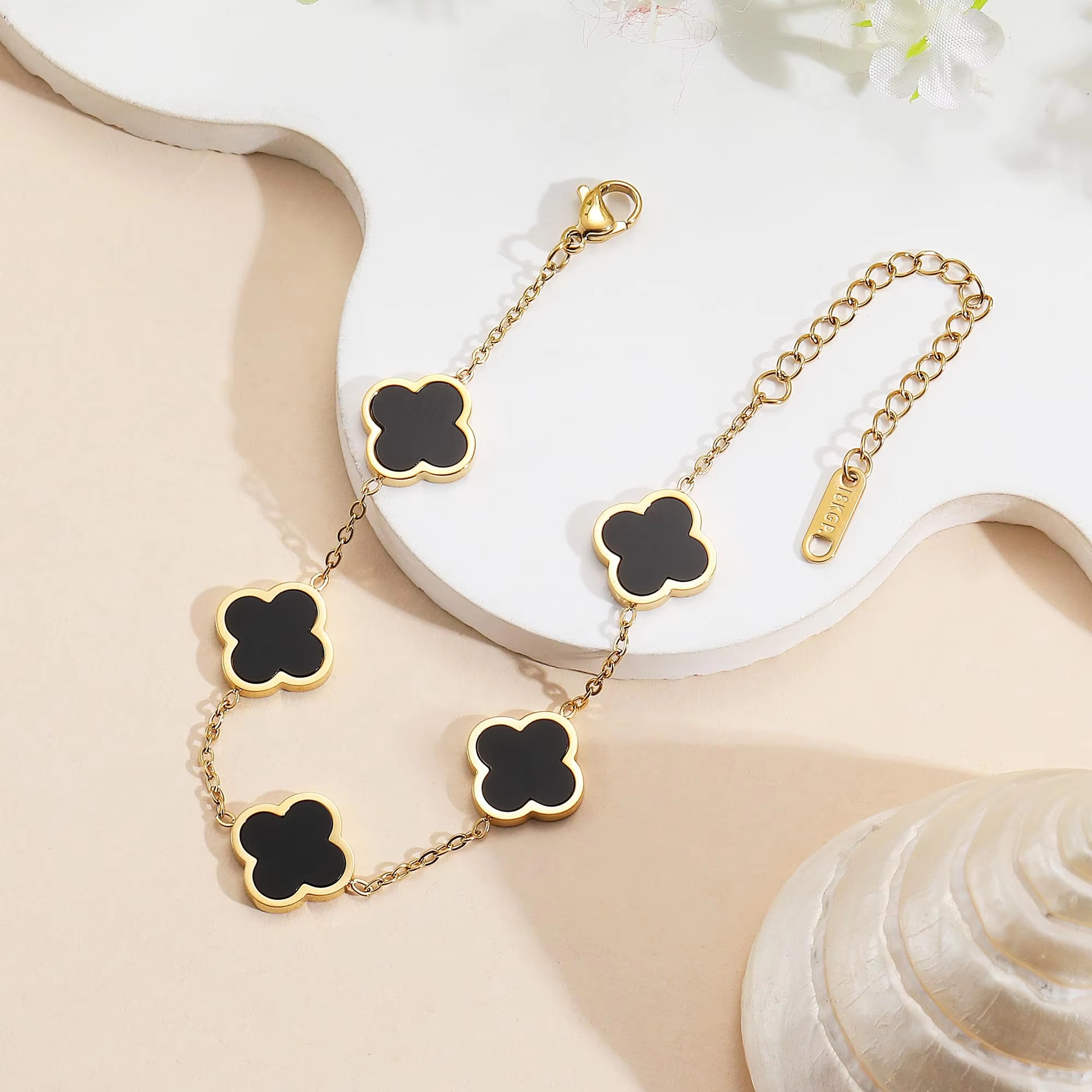 跨境爆款光面四叶手链女轻奢气质小众不锈钢四叶草18k镀金