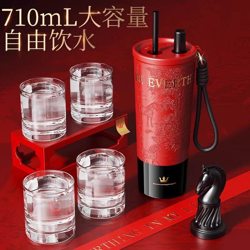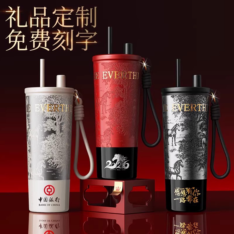 马年红色保温杯女生高颜值2026新款本命年礼物咖啡吸管水杯子定制