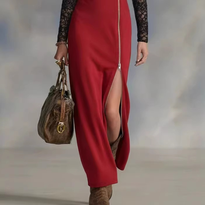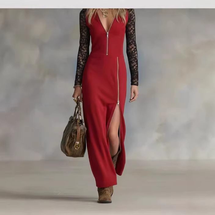爆款亚马逊2026欧美跨境气质V 领拉链侧开衩蕾丝拼接长袖连衣裙