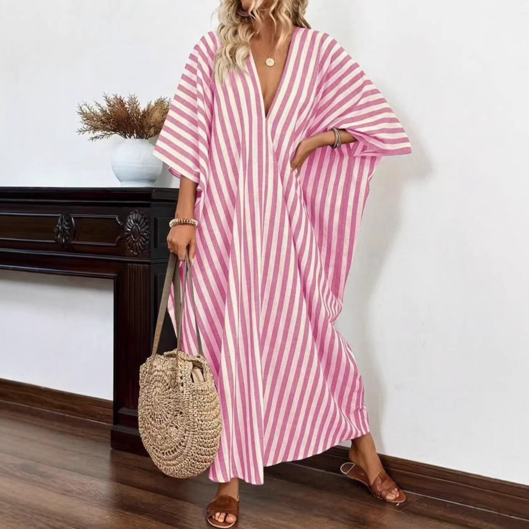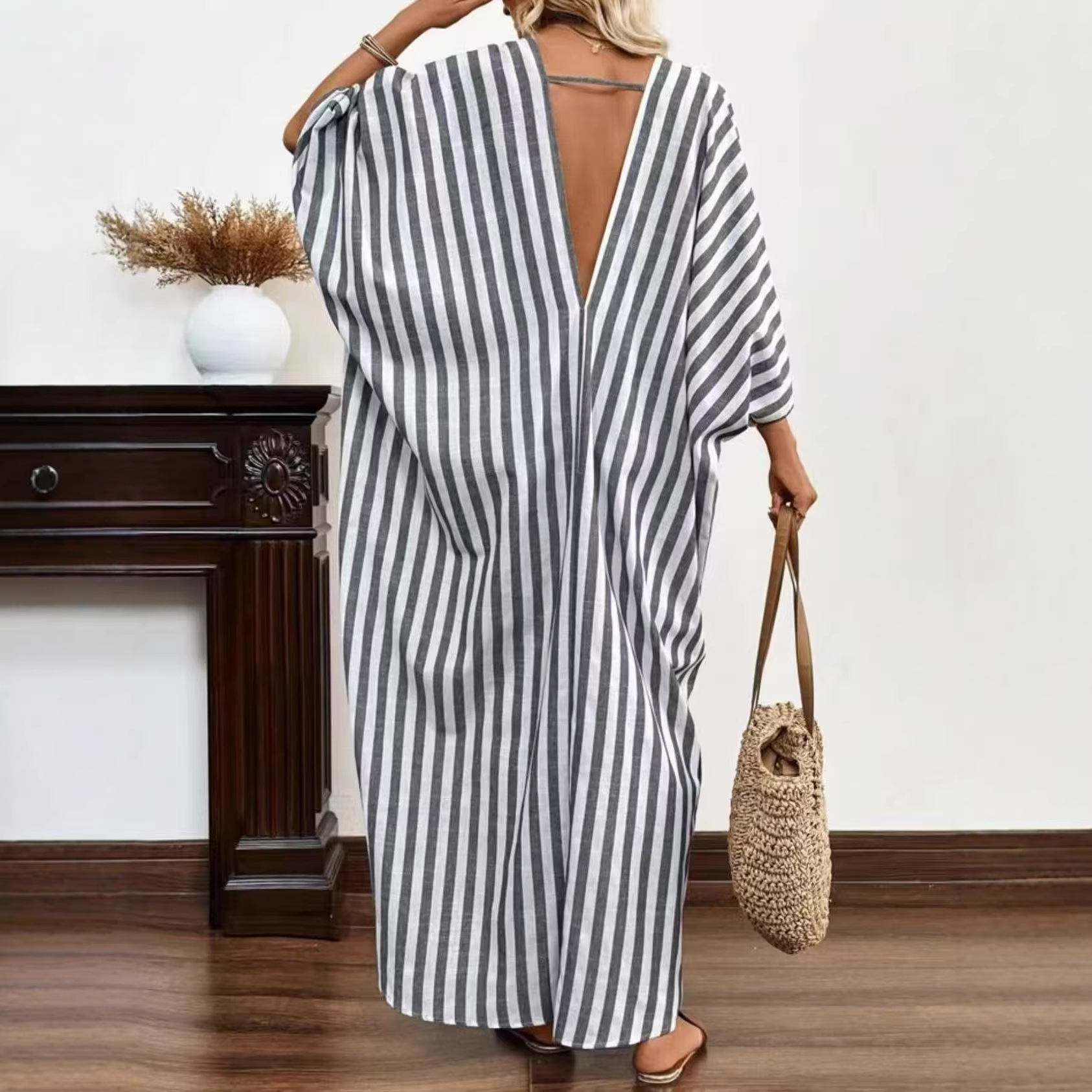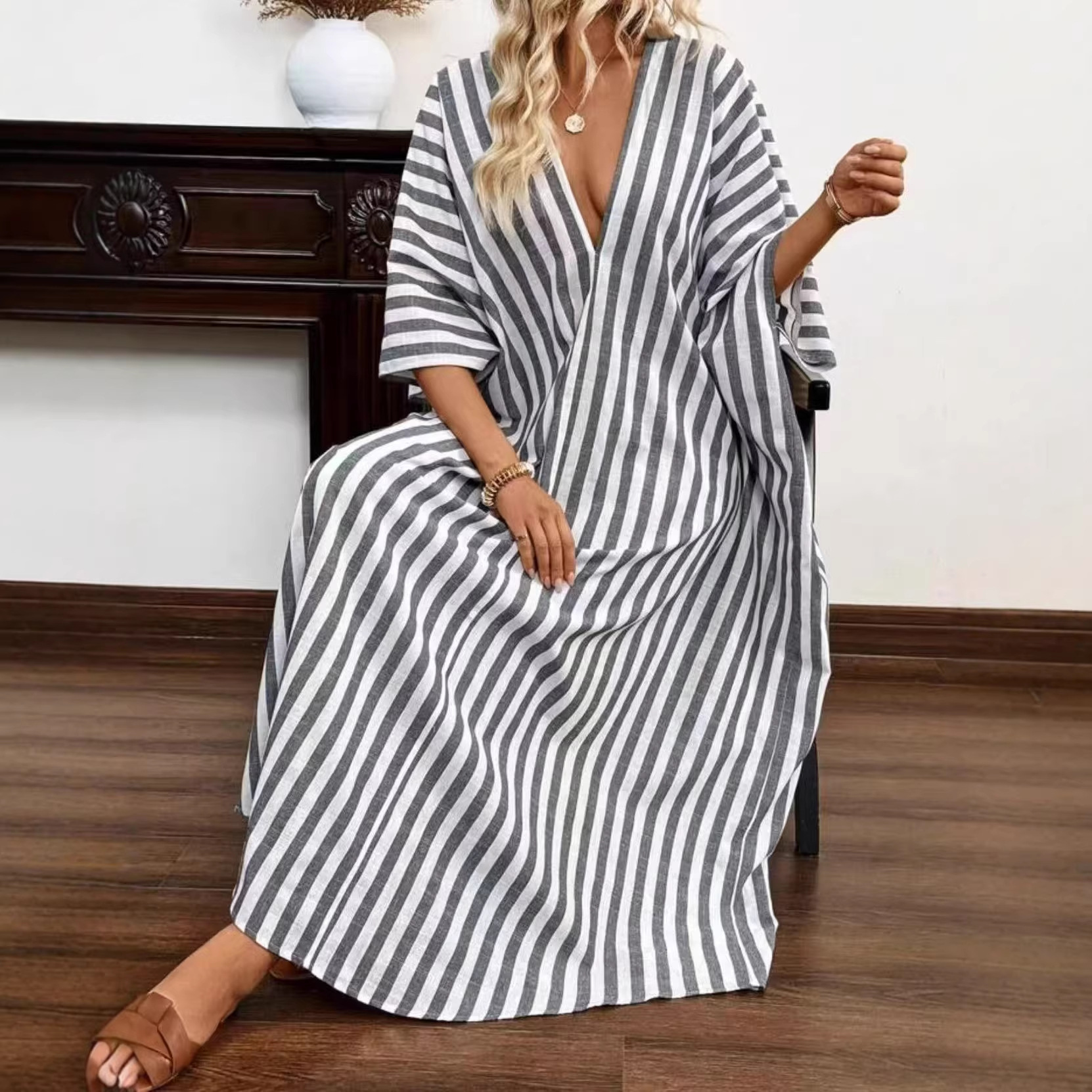 爆款现货欧美亚马逊时尚宽松深V领长款条纹气质连衣裙跨境慵懒风