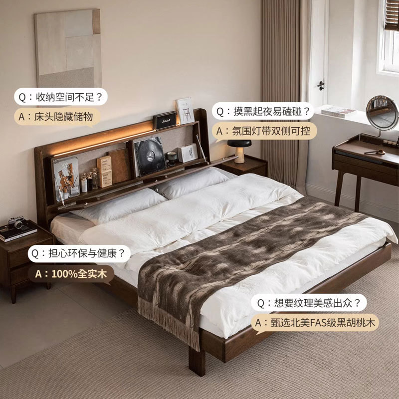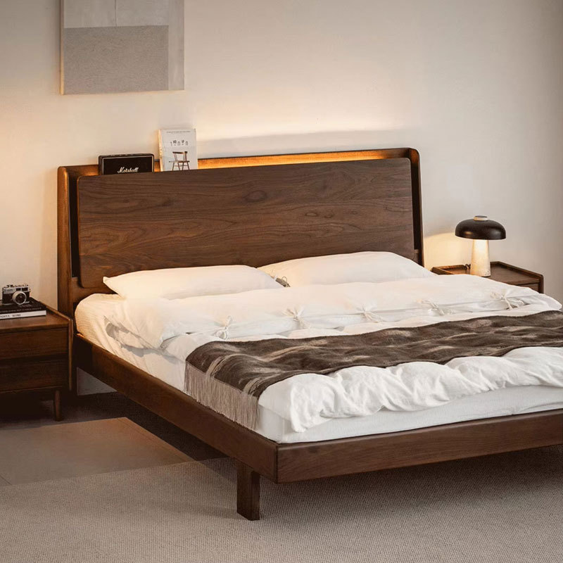 北美黑胡桃木暮光实木床北欧简约家用小户型齐边床主卧1米8双人床