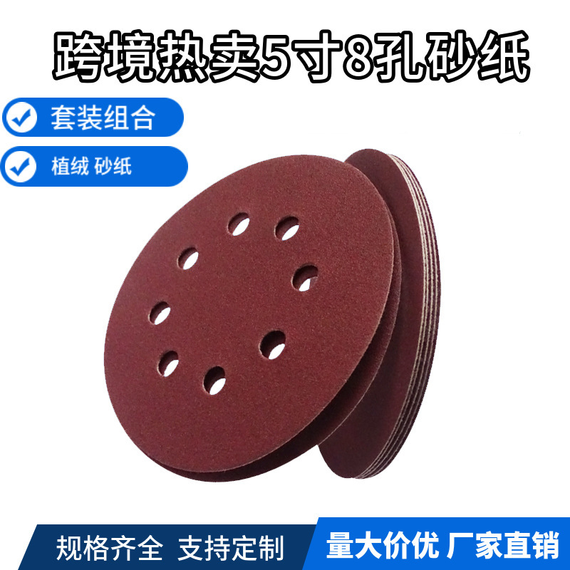 亚马逊 红砂5寸8孔套装 圆盘125mm 植绒气磨砂皮自粘拉绒砂纸跨境