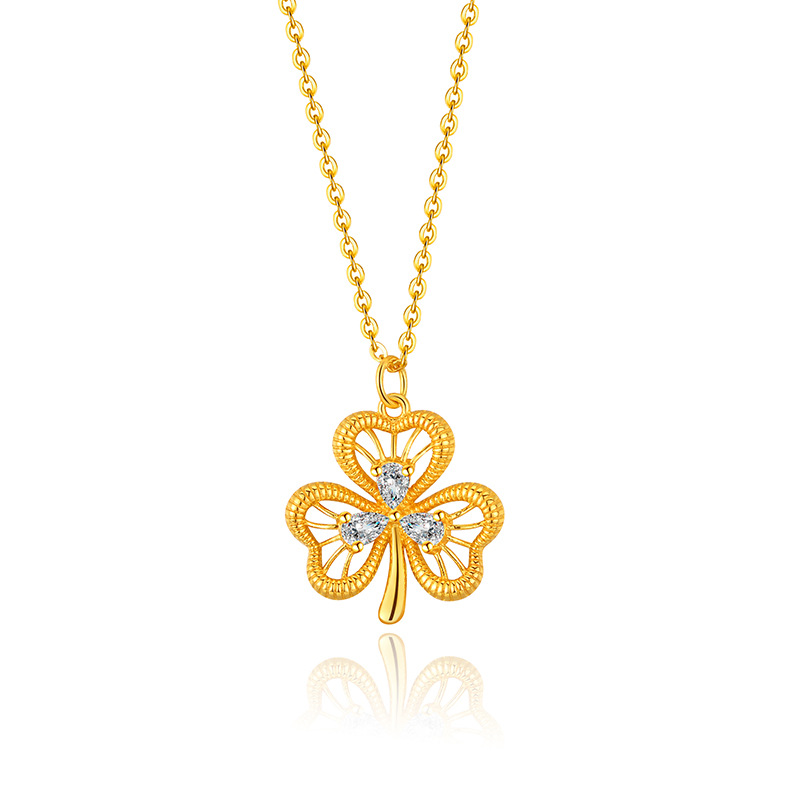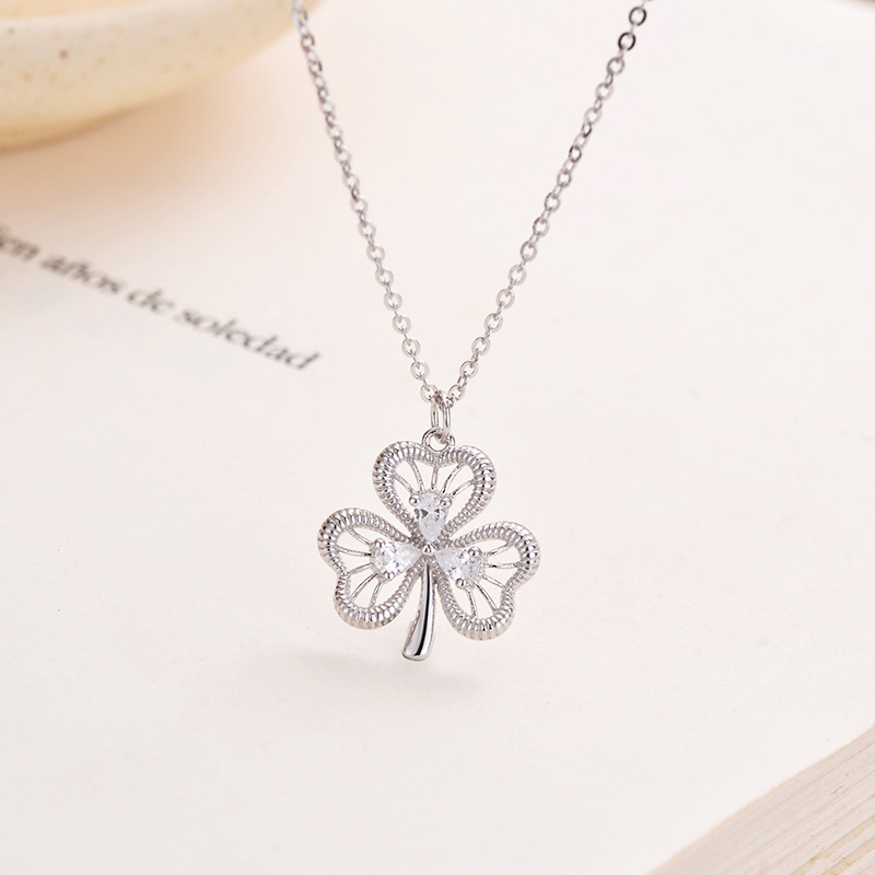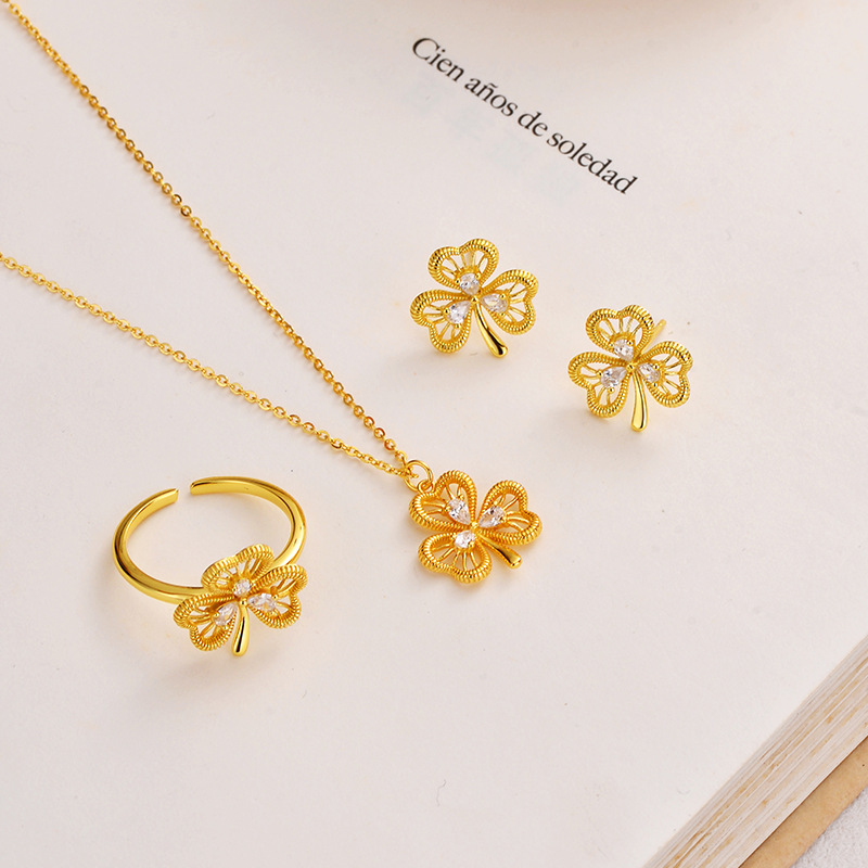 幸运三叶草925纯银项链女高级感镶锆石拉丝戒指爱心耳钉饰品套装