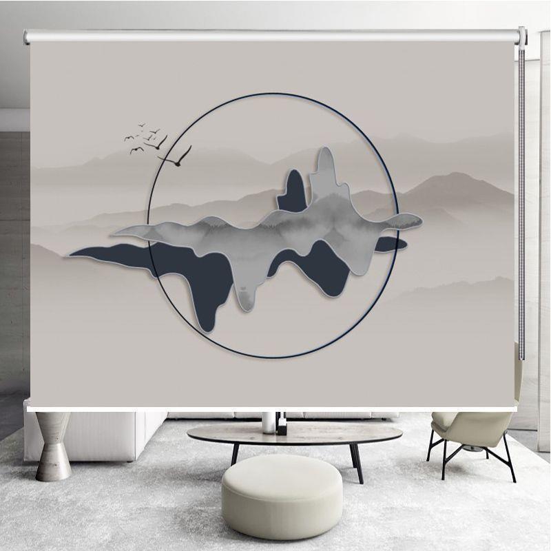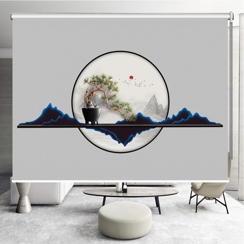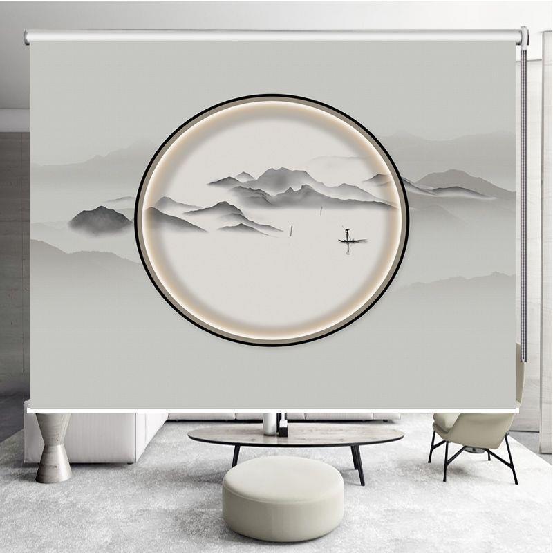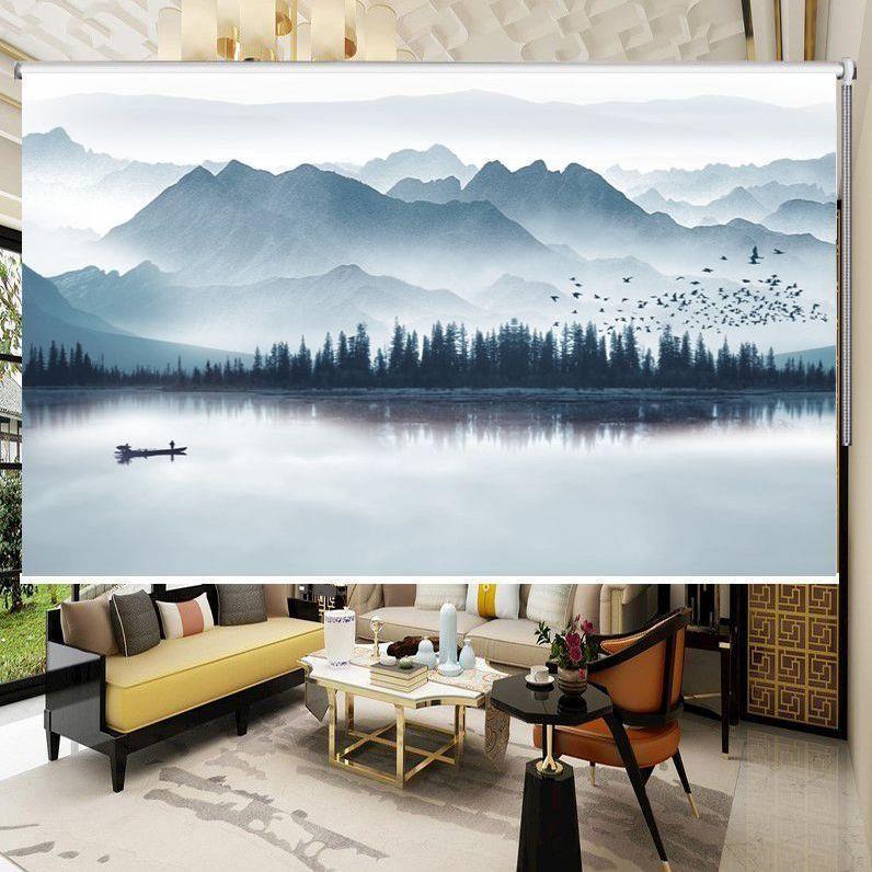 新中式山水画手拉帘升降遮阳光电动卷帘窗帘免打孔办公室书房