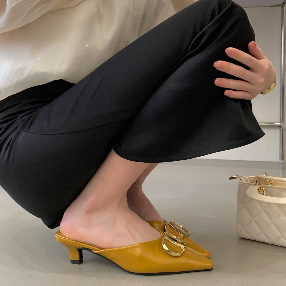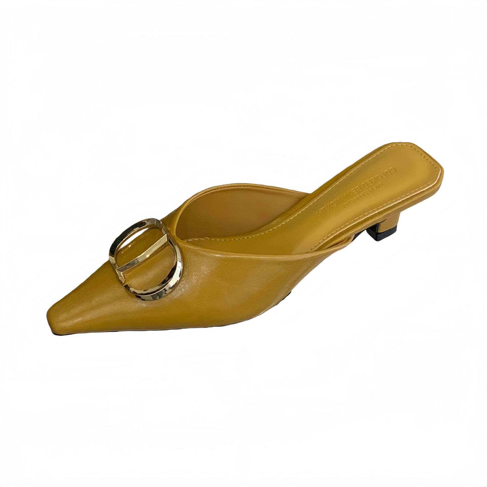 2026年春季新款时尚通勤鞋气质名媛小方头金色饰扣半托韩系女单鞋