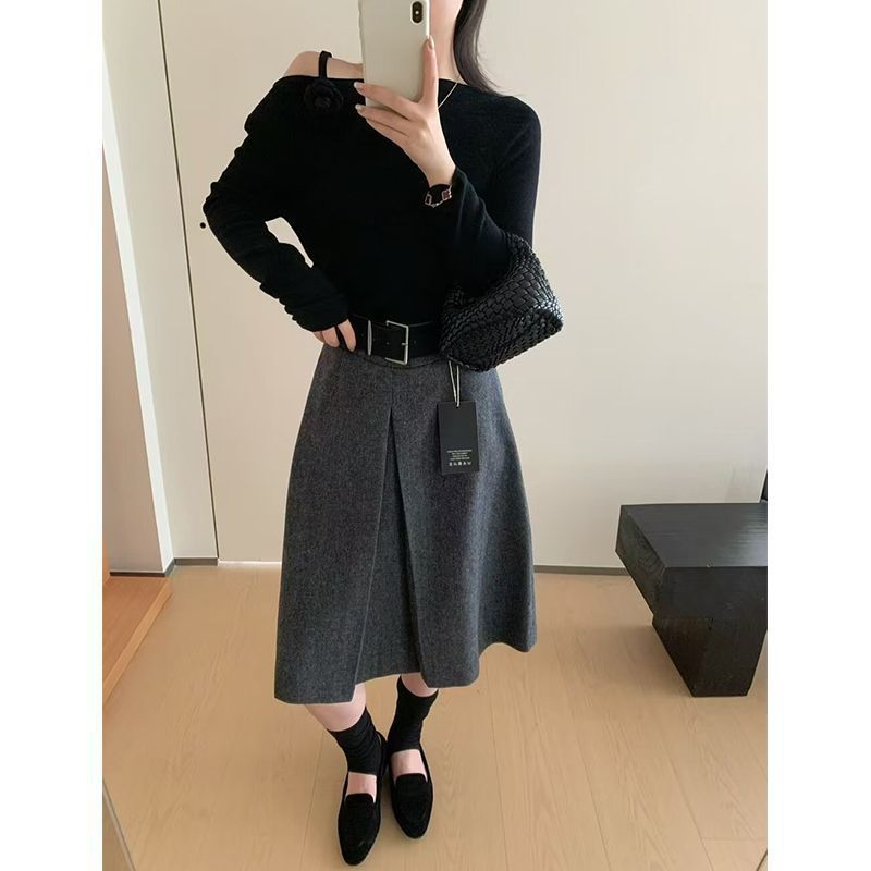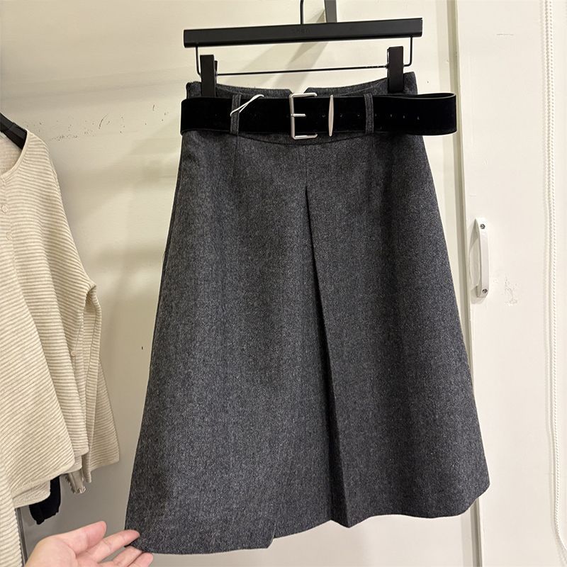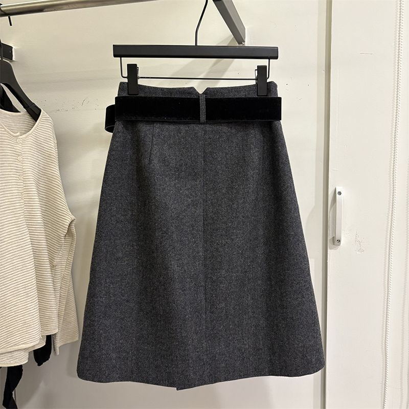 韩版高腰显瘦毛呢半身裙女2025秋冬新款简约休闲中长裙纯色勾花