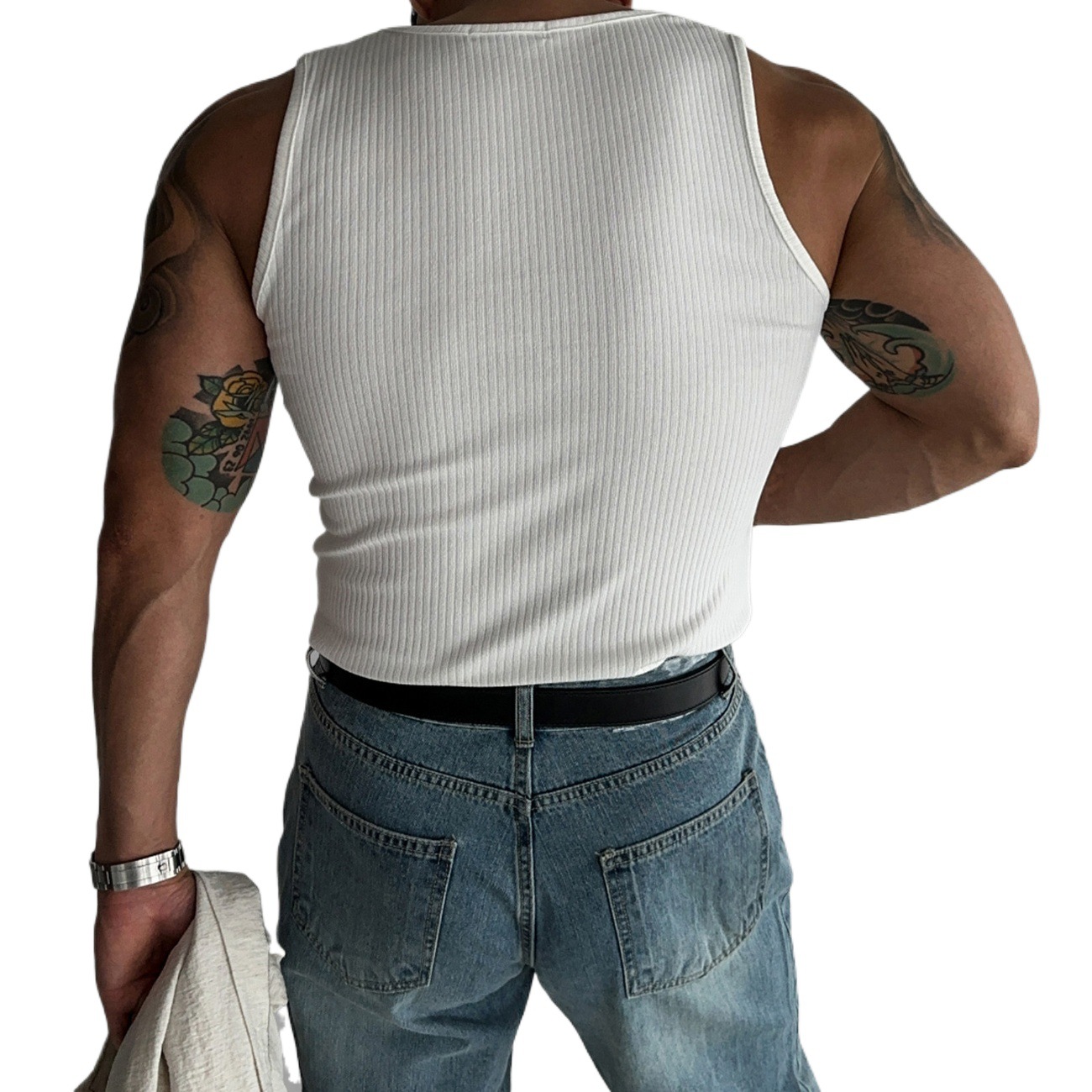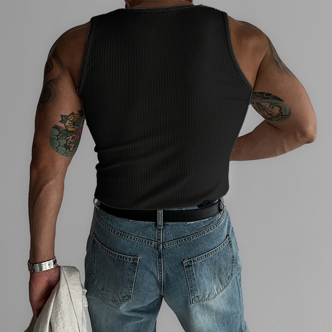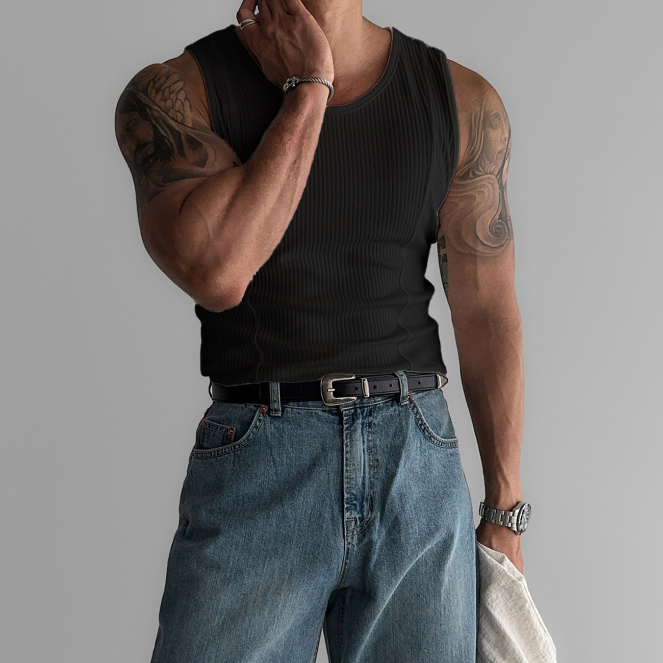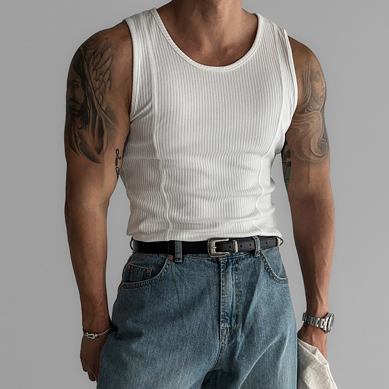 黑色显肌肉螺纹背心男夏季美式重磅健身训练汗衫圆领拼接无袖t恤
