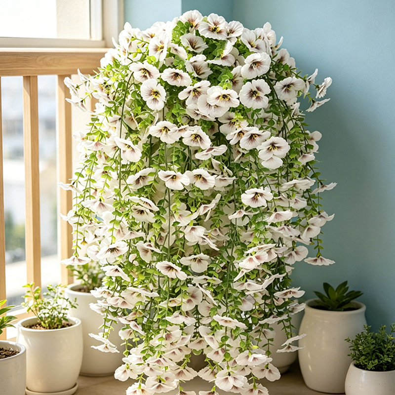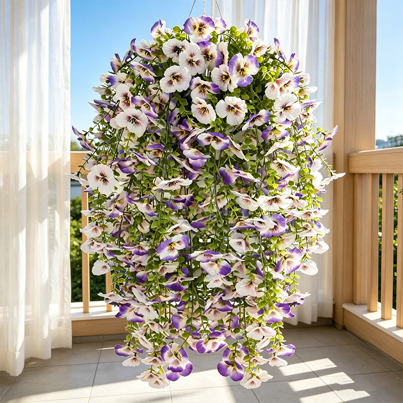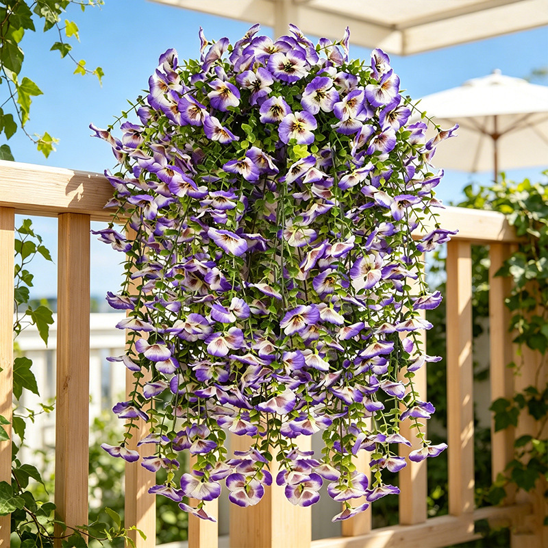 跨境仿真尤加利三色堇花束藤条户外庭院垂吊装饰造景植物假花批发