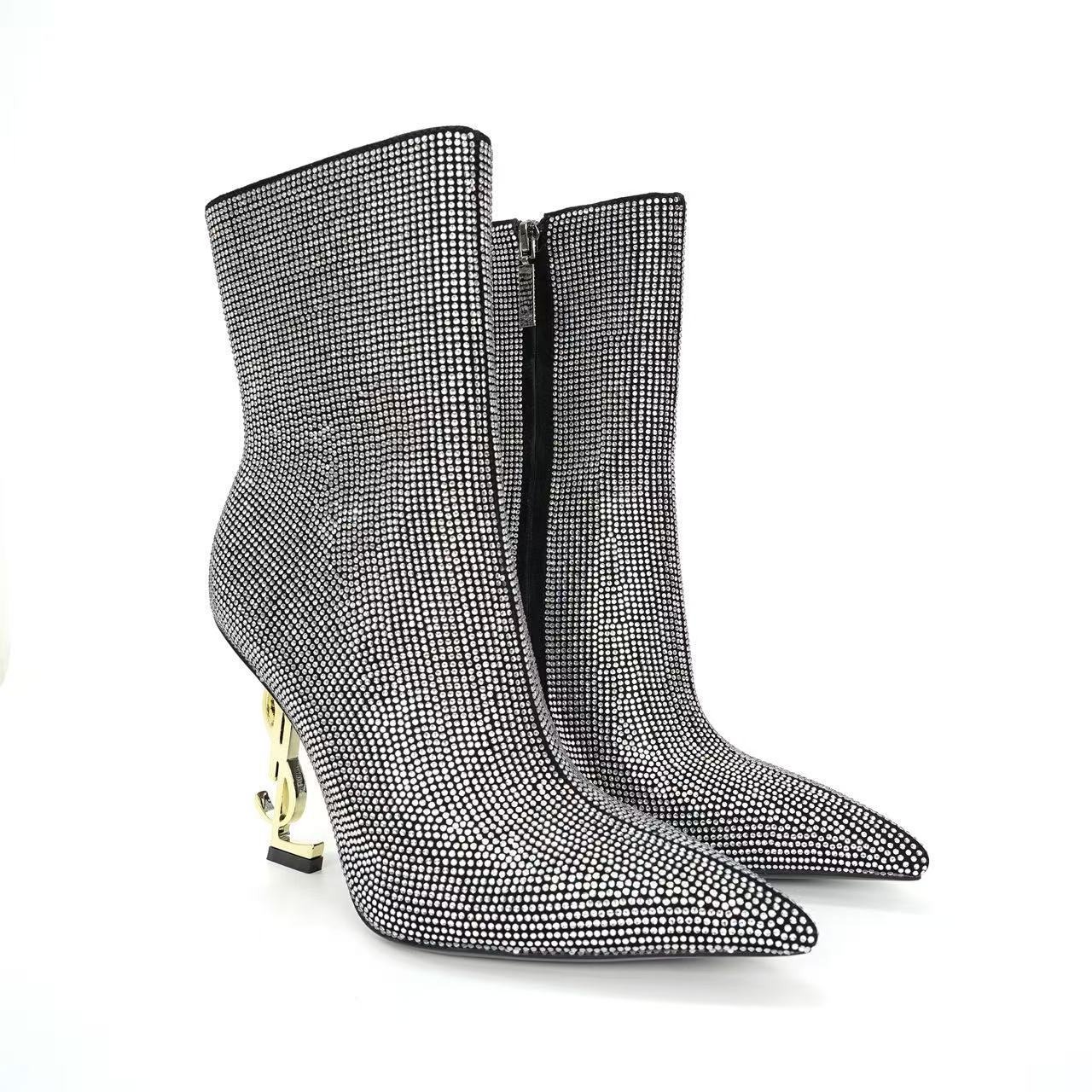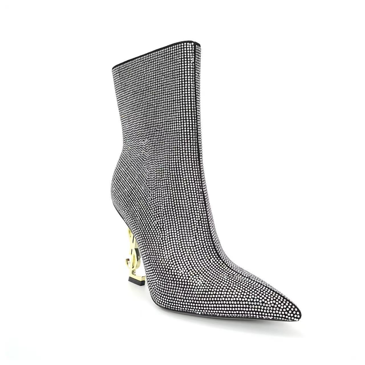 2025新款韩版尖头水钻短靴女异形跟侧拉链及踝靴时尚百搭潮流女靴