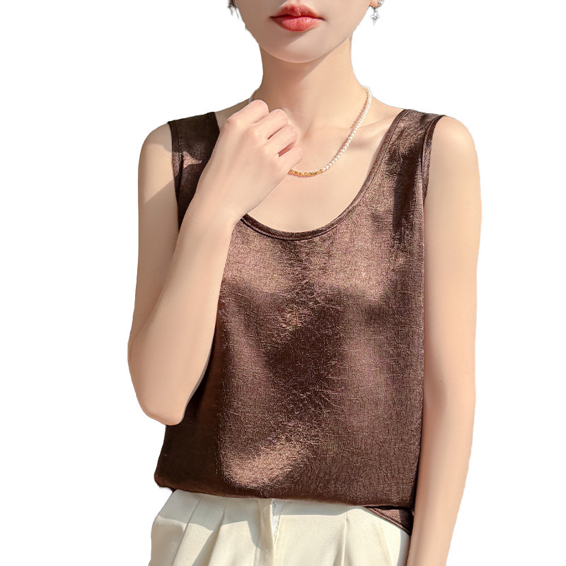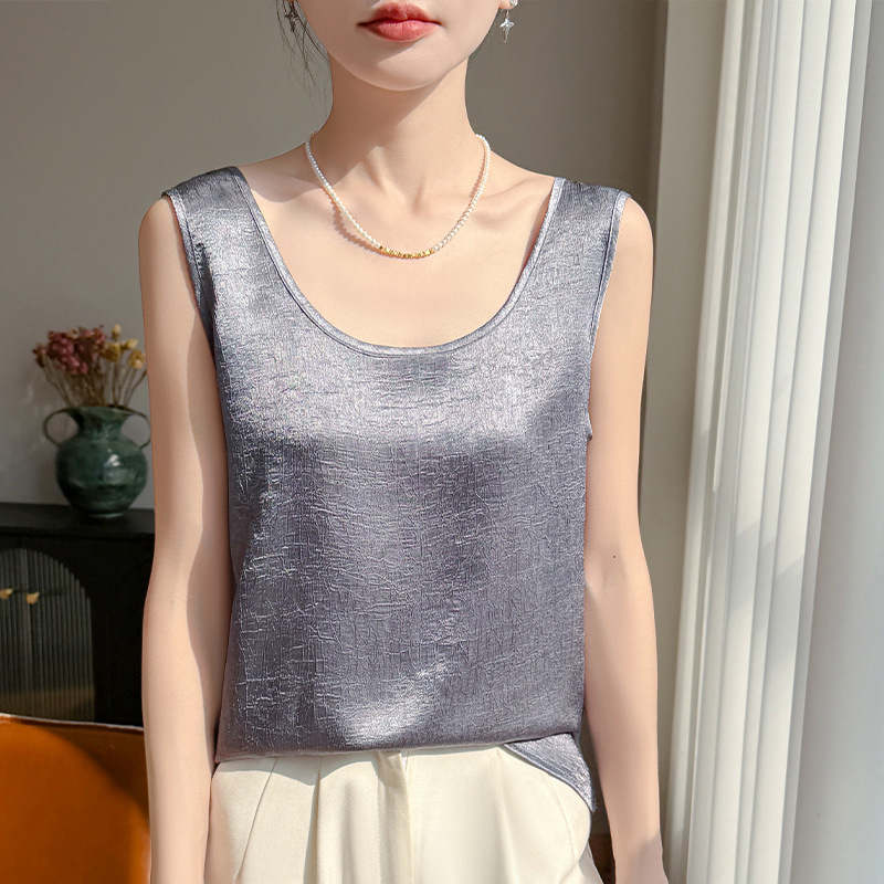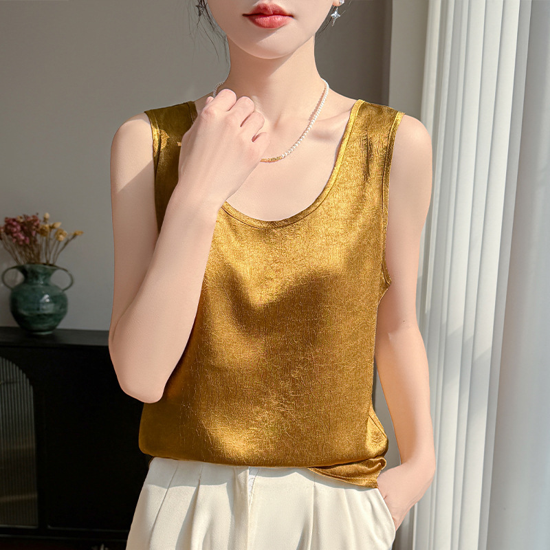 2026年春夏新款丝滑缎面U领吊带背心女纯色宽松无袖褶皱套头上衣