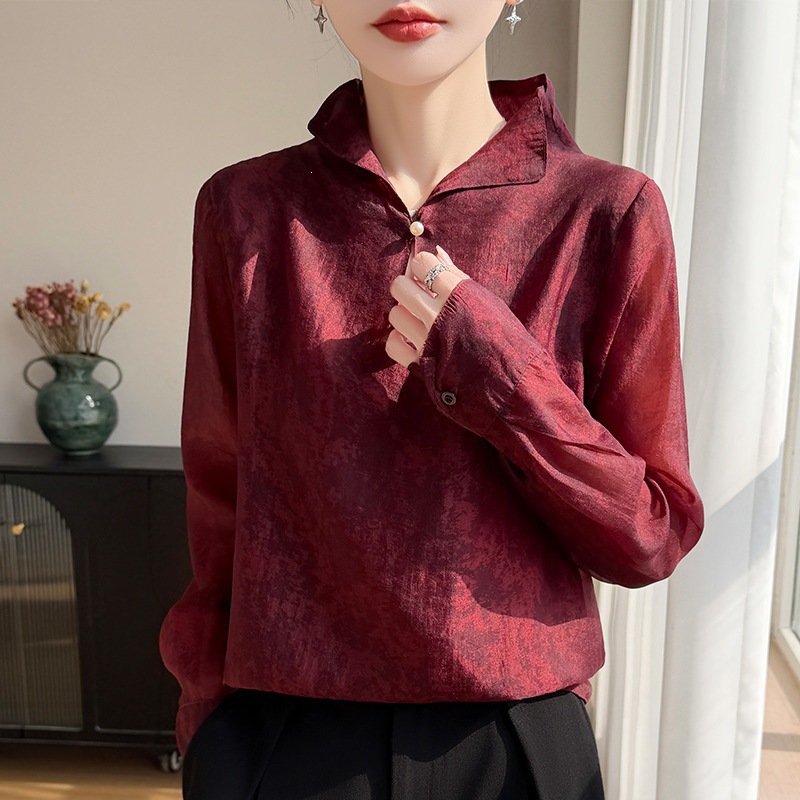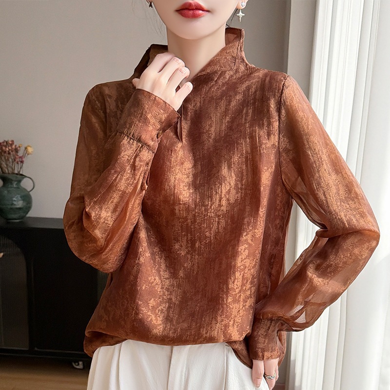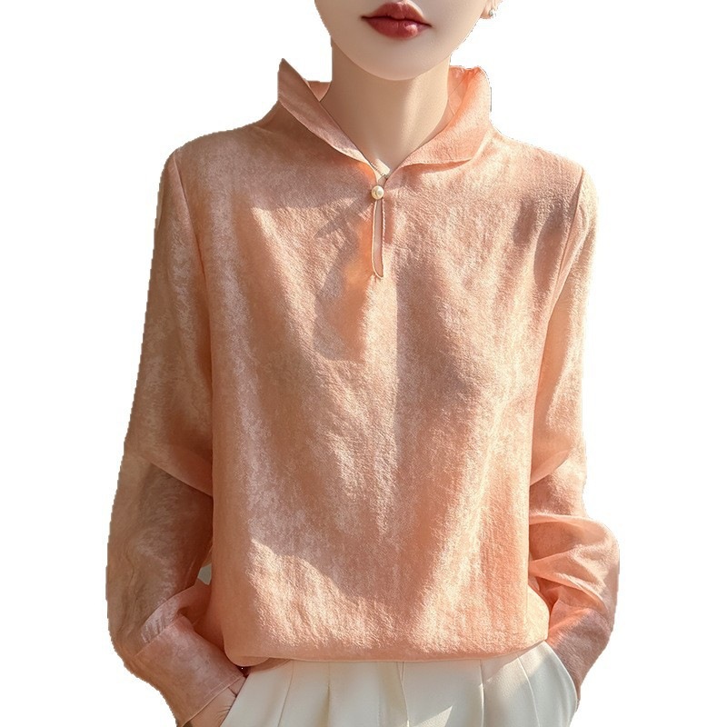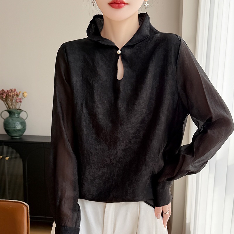 春夏新款新中式国风缎面立领衬衫长袖女暗花薄款衬衫上衣设计感