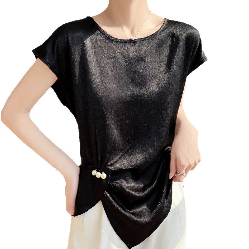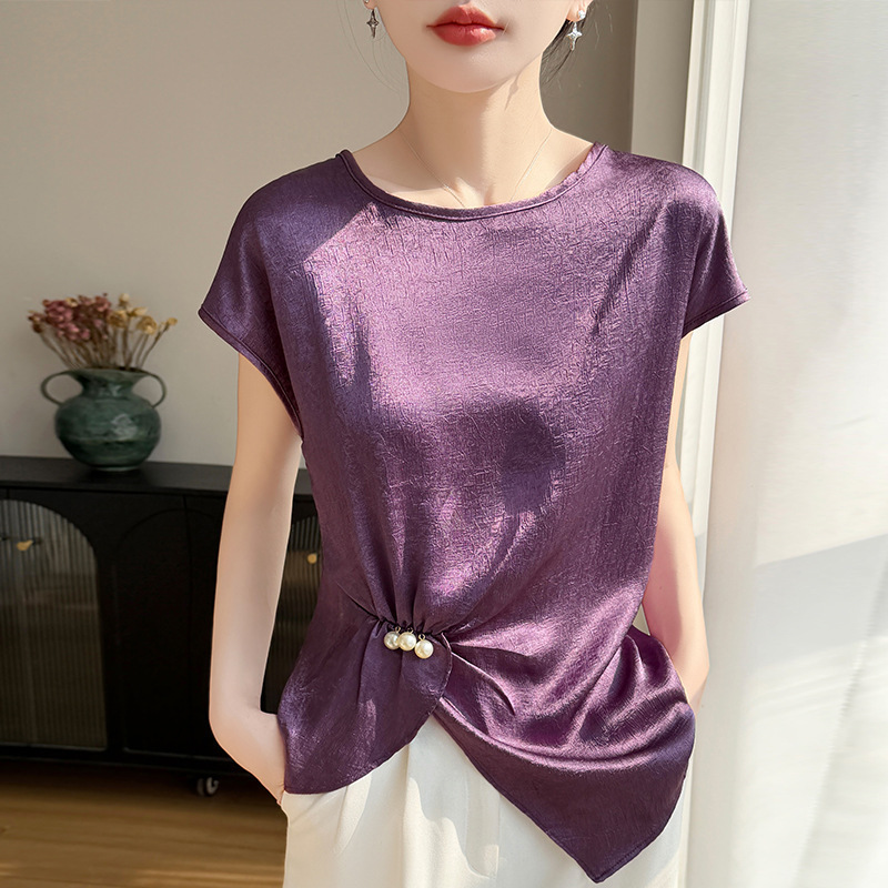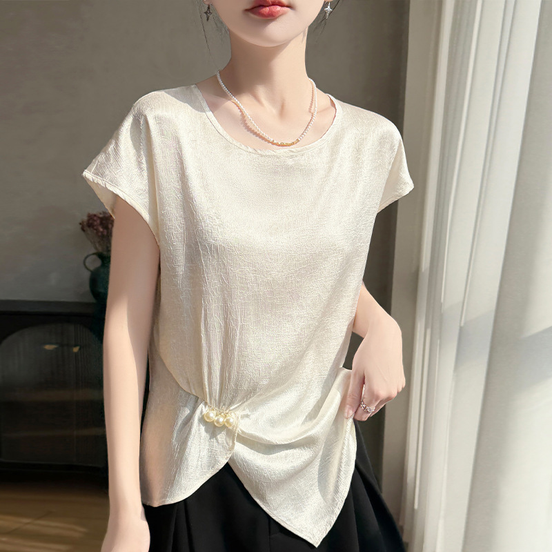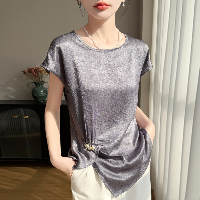 2026新款缎面仿真丝夏装气质上衣时尚暗纹圆领夏季设计感短袖t恤