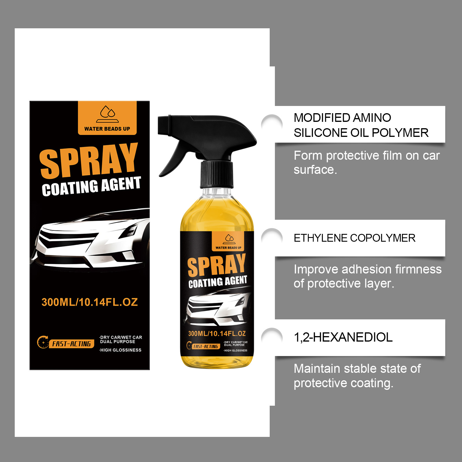 | 类型 | 汽车涂层喷雾 | 主要成分 | 水、 改性氨基硅油高分子聚合物、 乙烯共聚物、 1,2-己二醇、 EDTA-2Na |