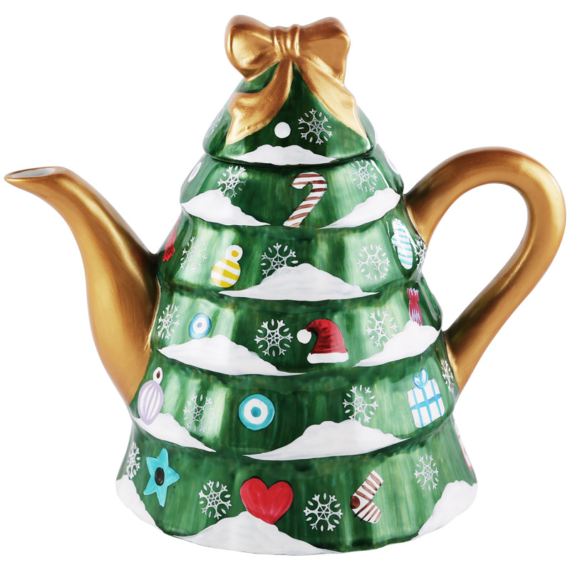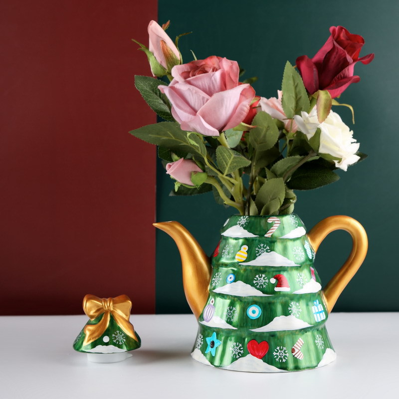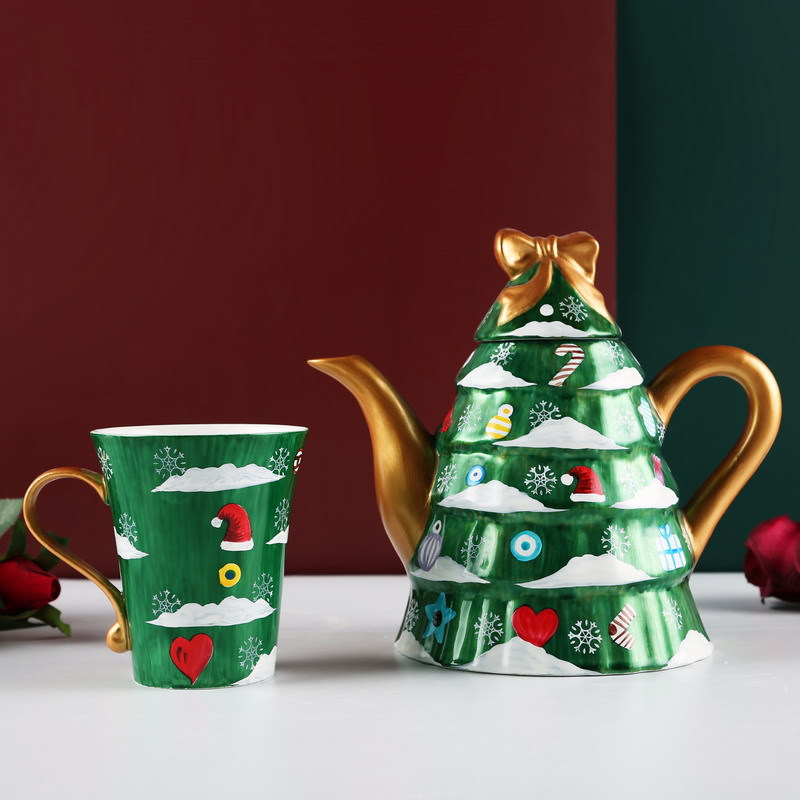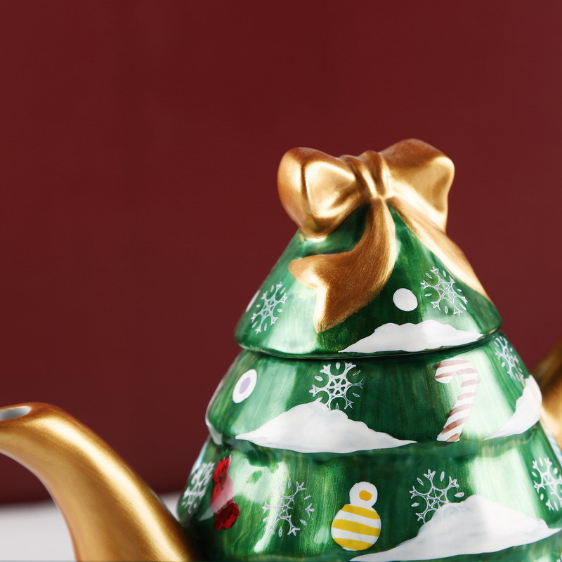 ins欧式圣诞陶瓷摆件 亚马逊热销特色手绘茶具手工彩绘圣诞树茶壶