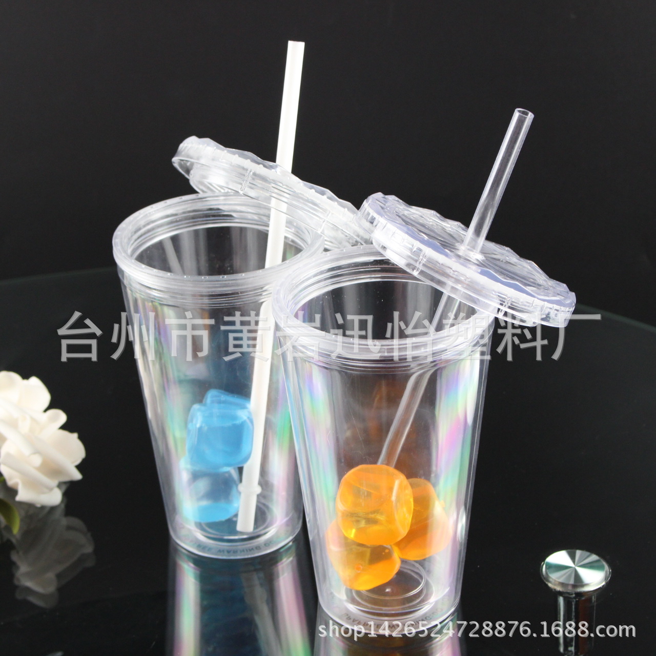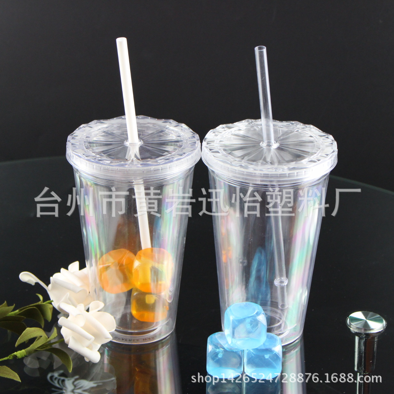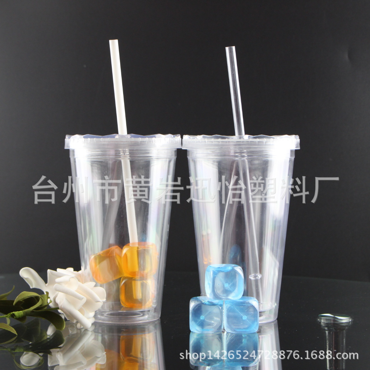 双层塑料PS吸管杯 450ml塑料吸管杯 16oz钻石盖双层杯冰粒广告杯