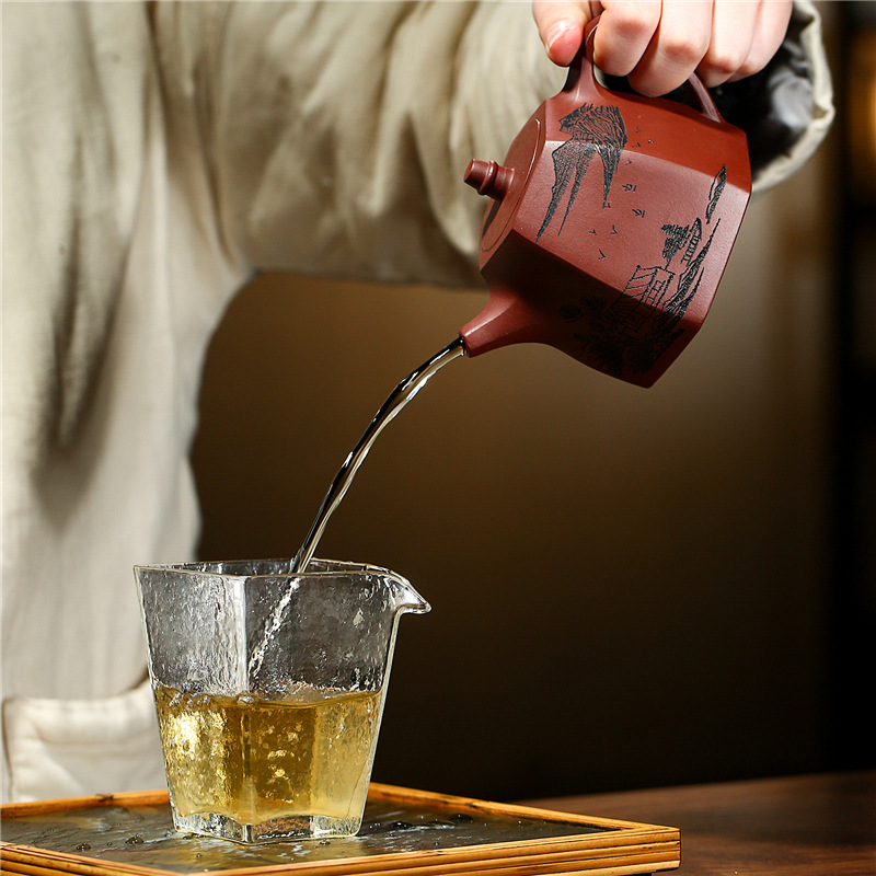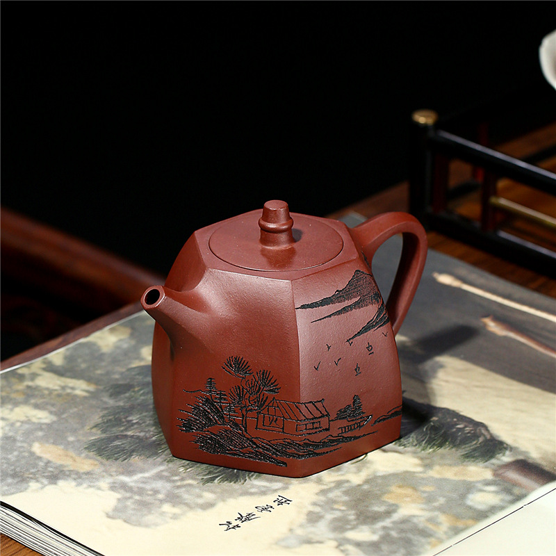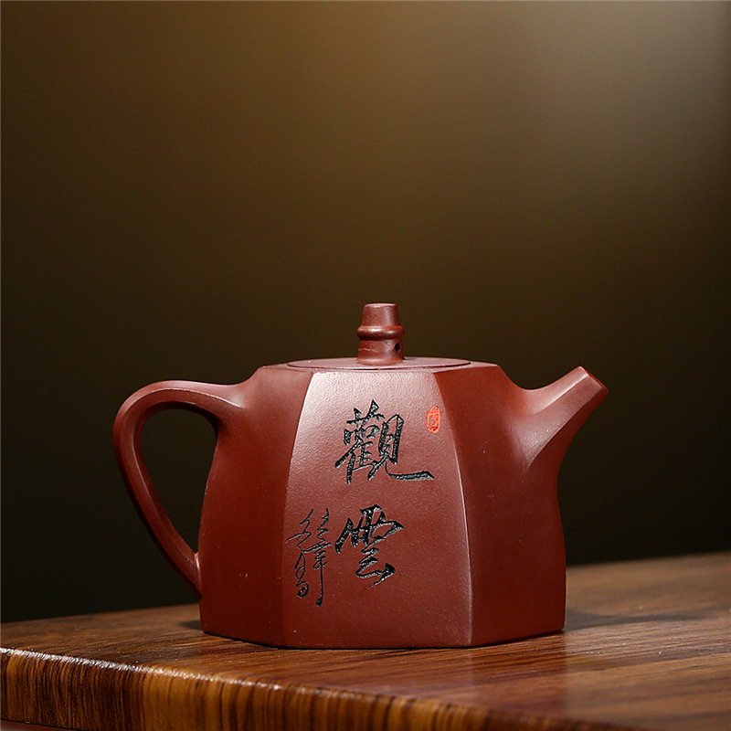 宜兴紫砂壶批发原矿紫泥六方汉铎茶壶纯手工刻绘山水内壁章茶具