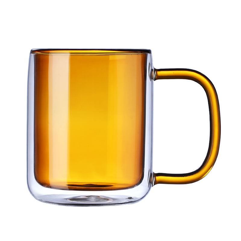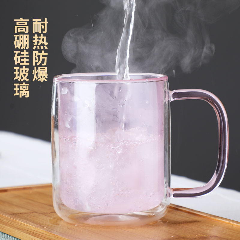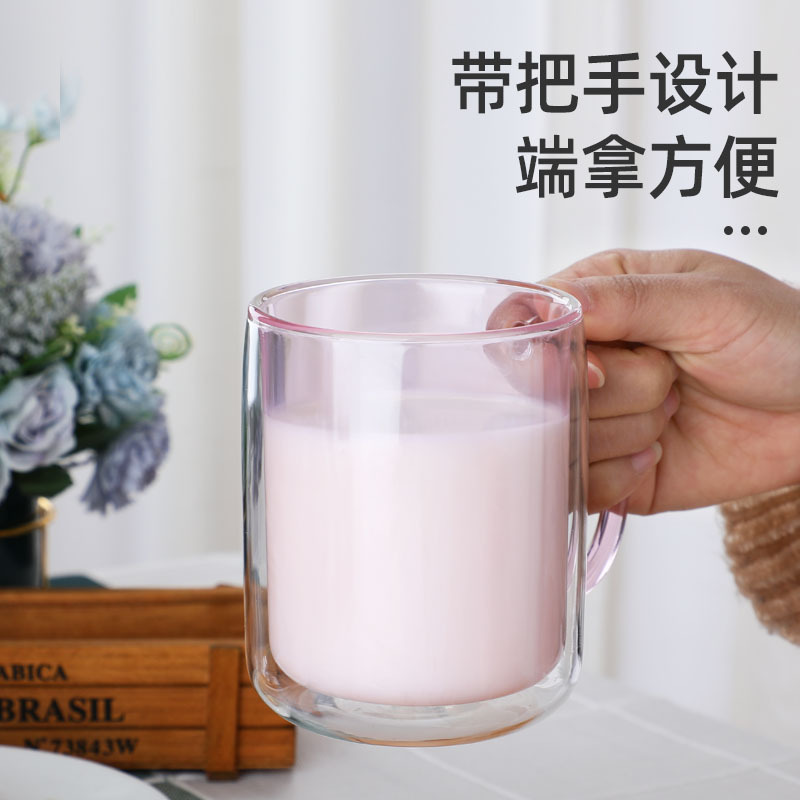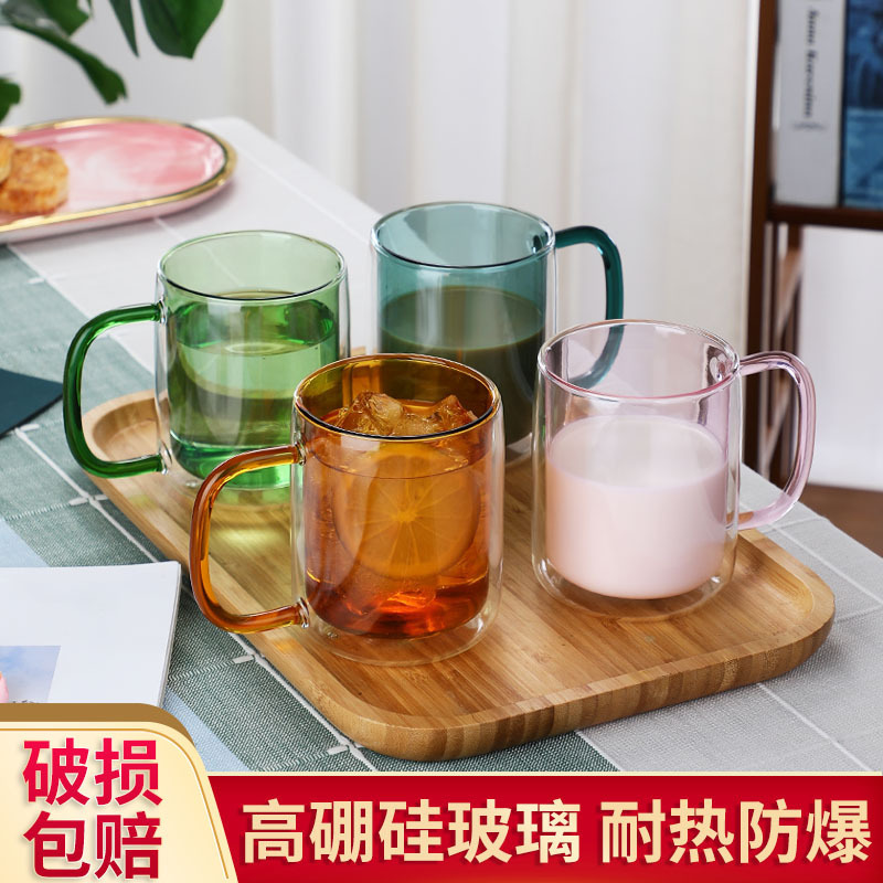简约ins双层防烫彩色玻璃杯带把手创意耐热杯家用咖啡泡茶马克杯