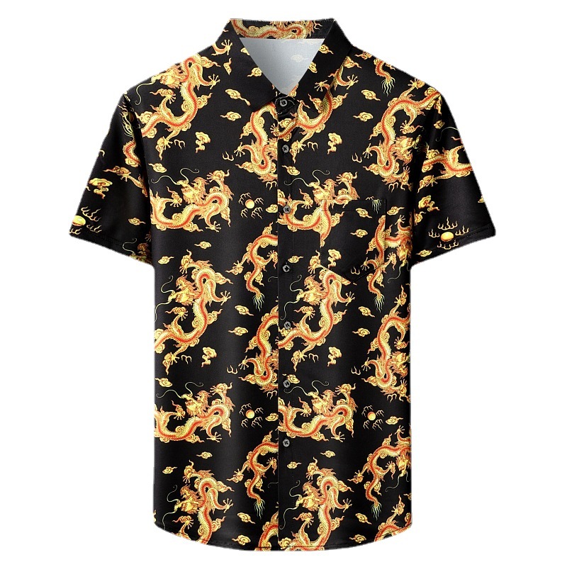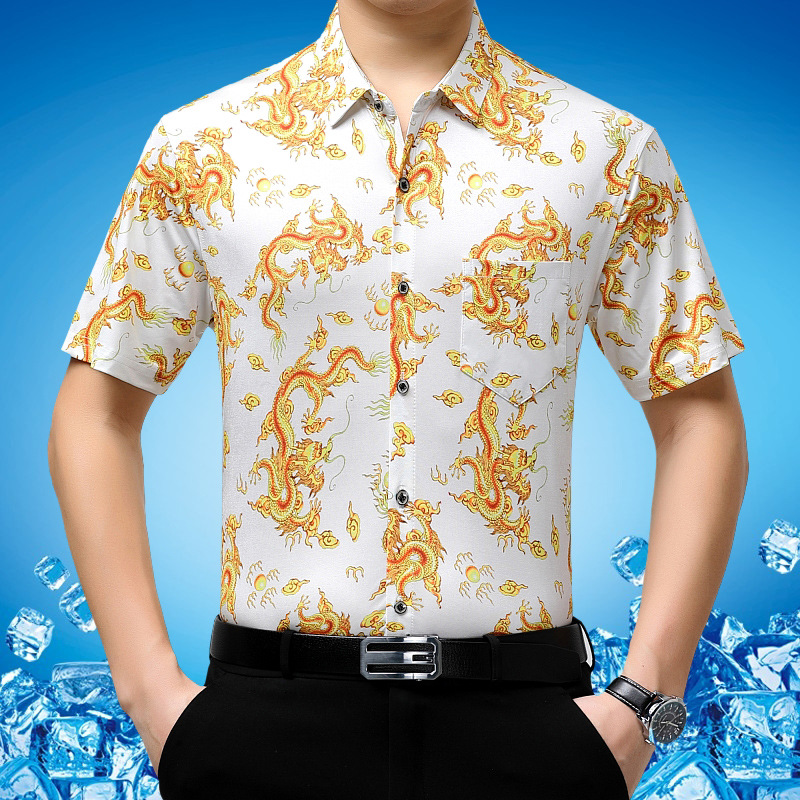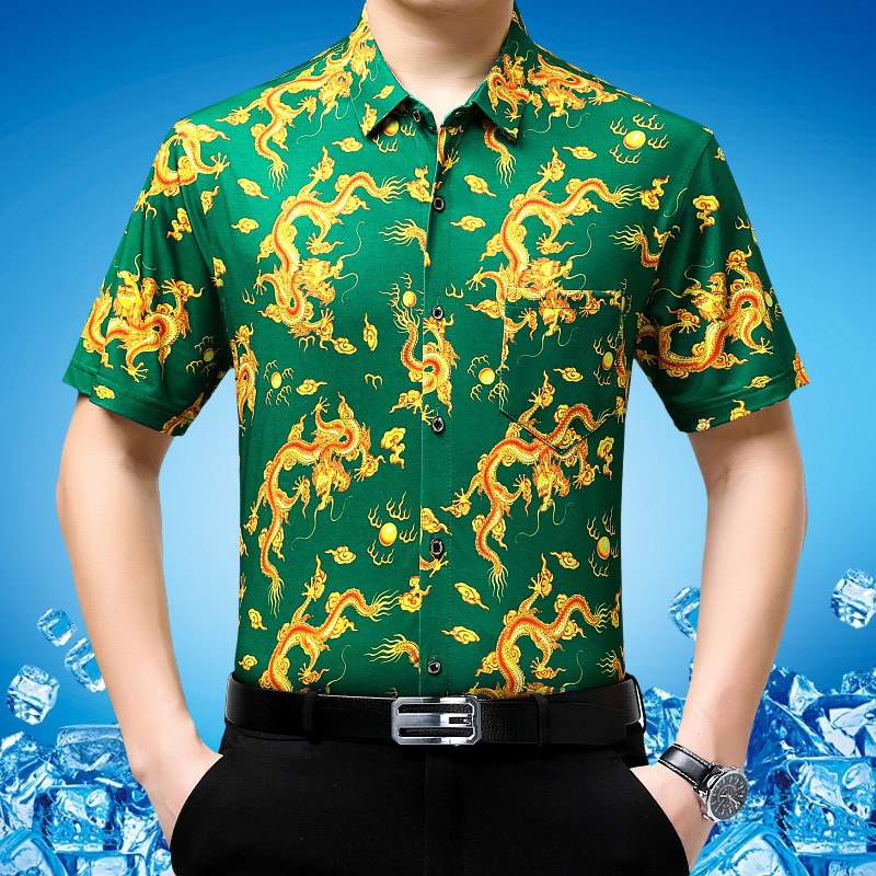 短袖印花衬衫男中年宽松坠感冰感海边度假爸爸上衣外贸衬衣男款夏