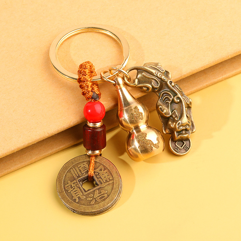 创意复古貔貅钥匙扣纯黄铜葫芦汽车钥匙链书包挂件合金五帝钱吊坠