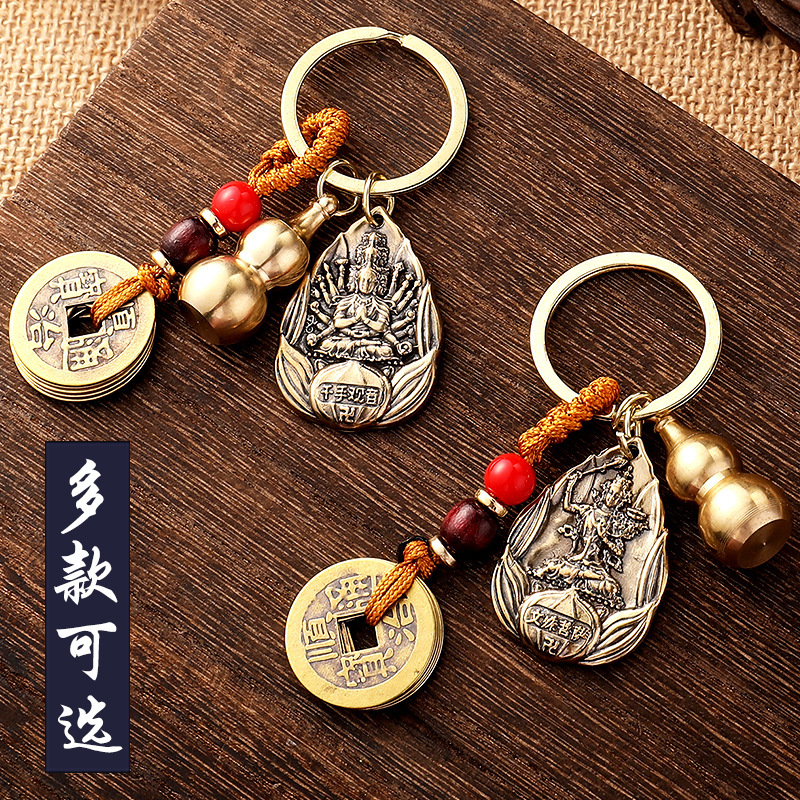 黄铜八大守护神挂件配饰情侣汽车钥匙扣空葫芦送砂黄绳五帝钱配饰