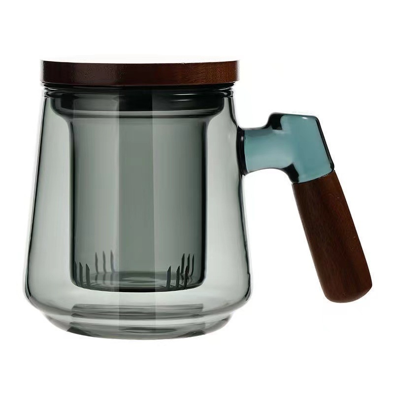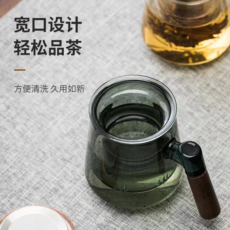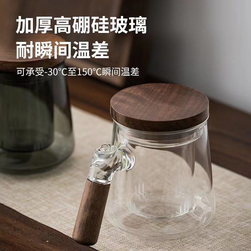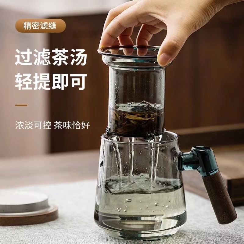 泡茶观山茶杯茶水分离胡桃木把手咖啡杯耐热男士办公室喝茶玻璃杯