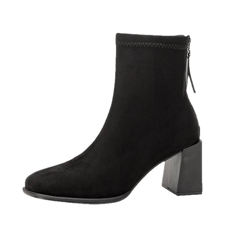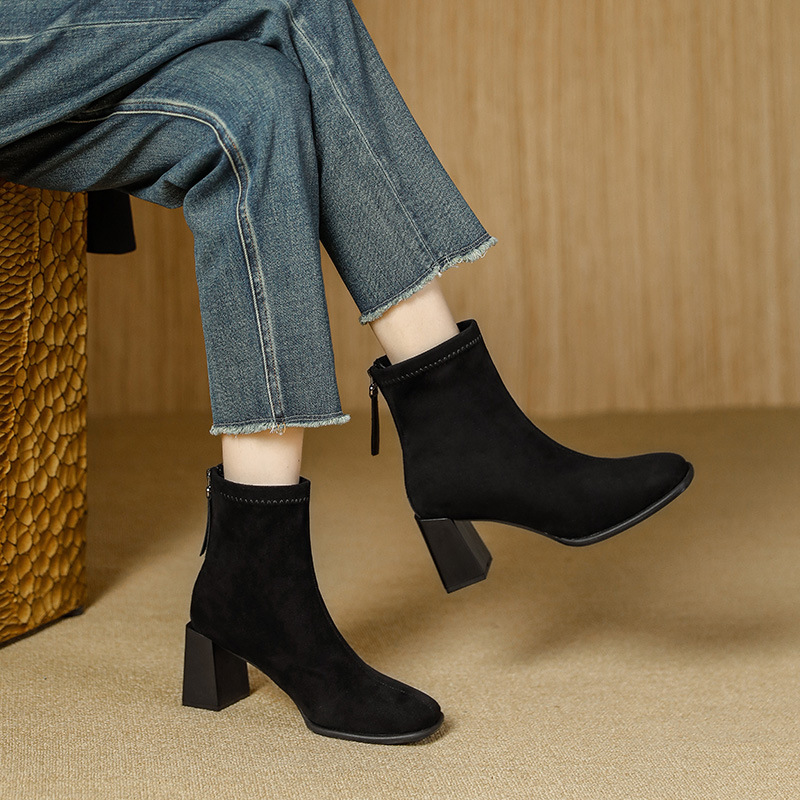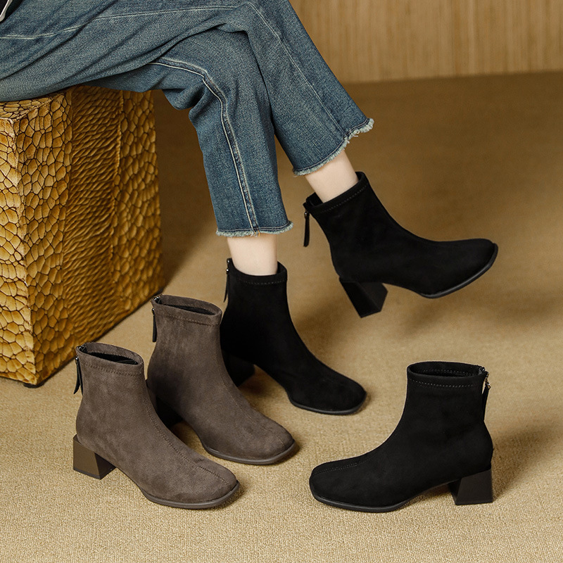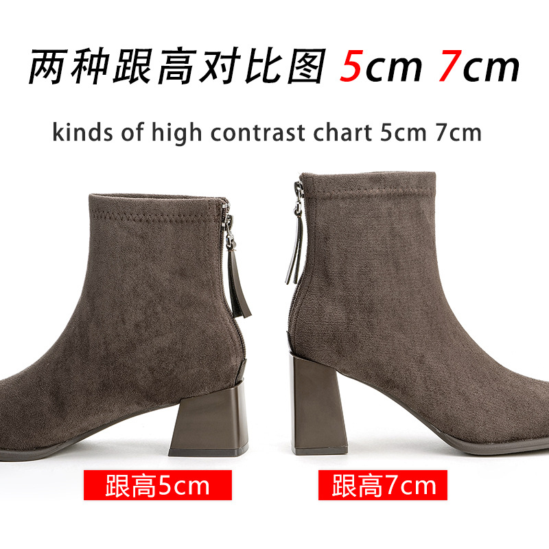 法式加绒短靴秋冬季2026年新款 粗跟方头 瘦瘦靴高跟弹力靴子批发