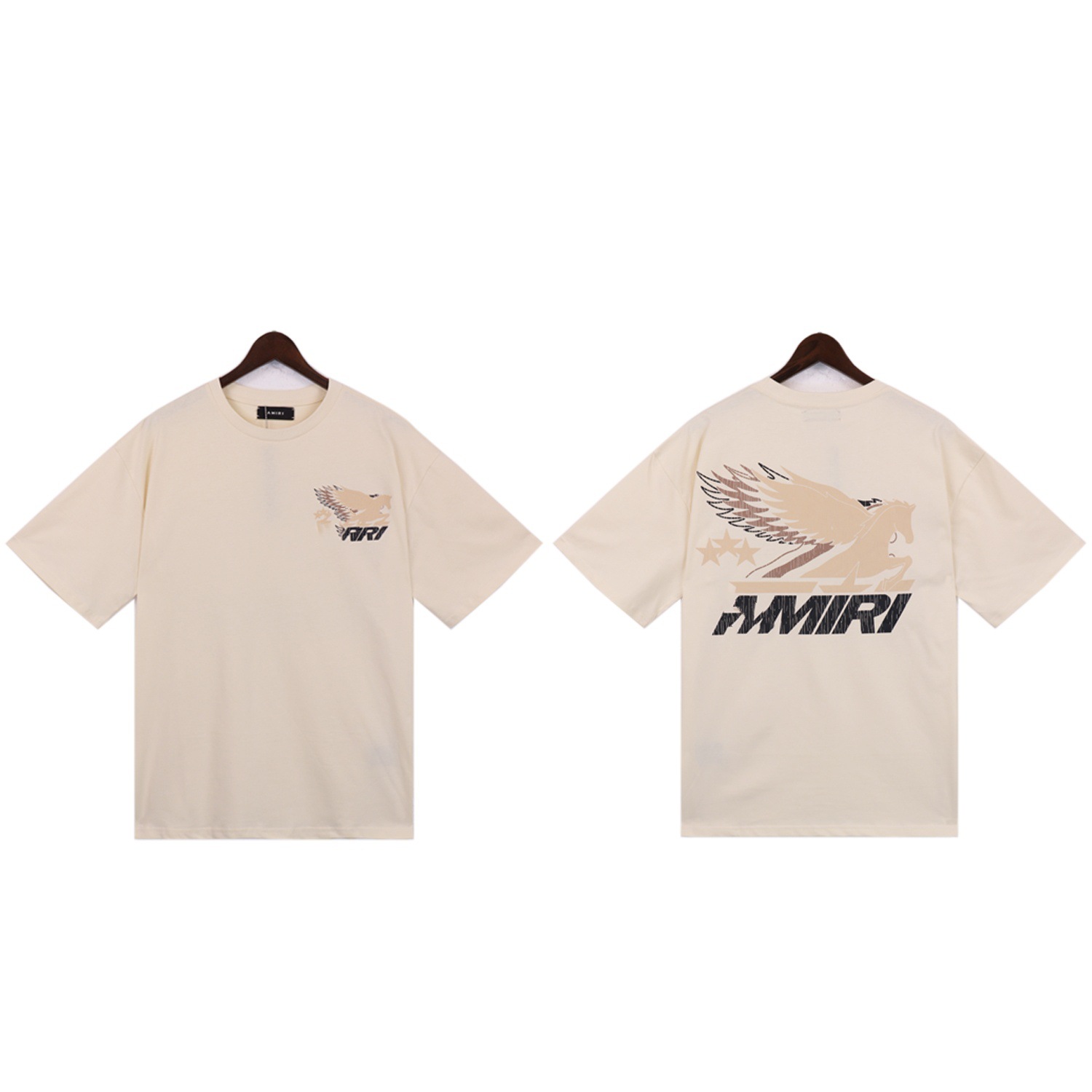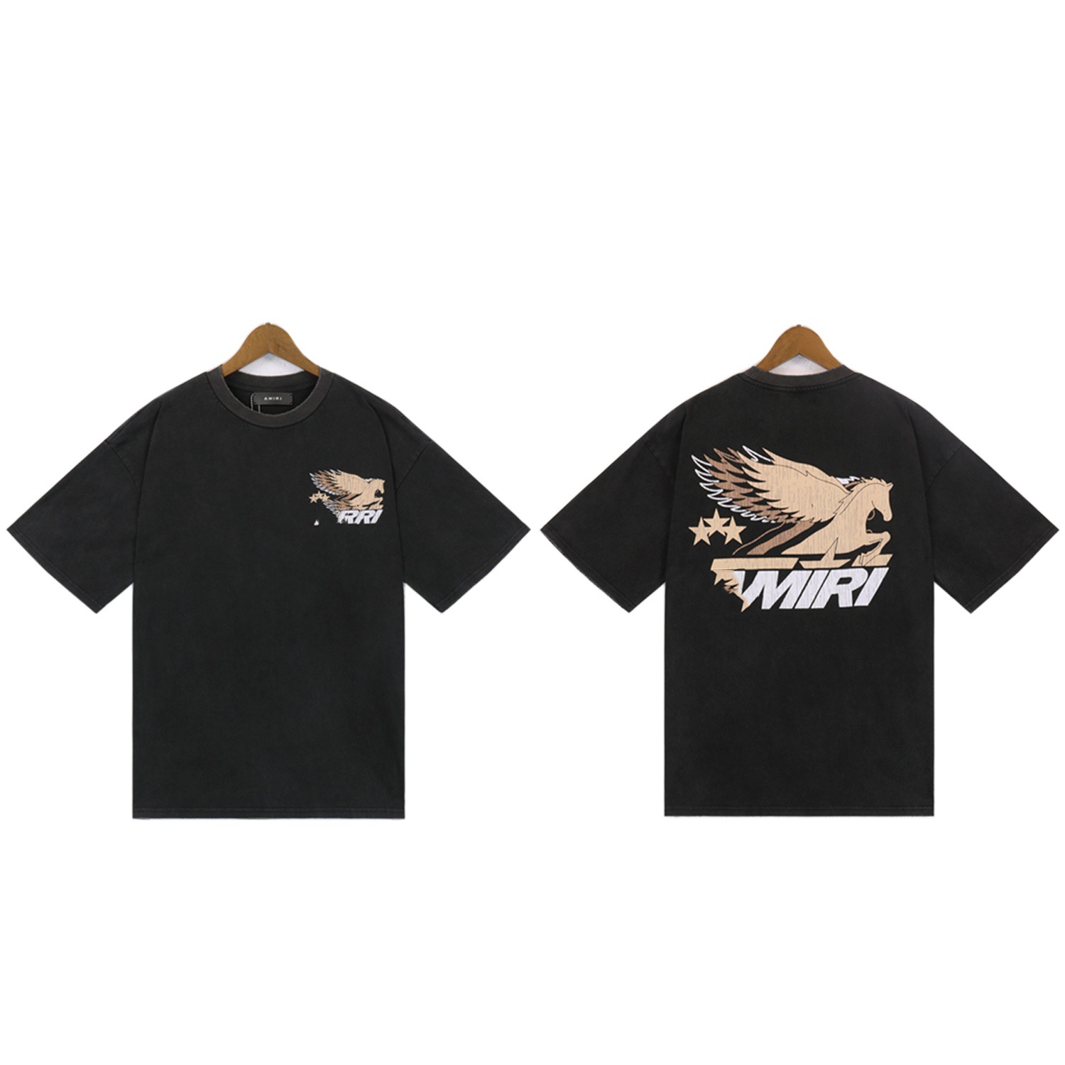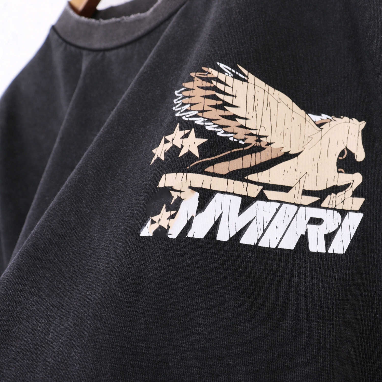 欧美跨境AMIRIVintagePegasus黑色洗水做旧磨破短袖飞马T恤复古风