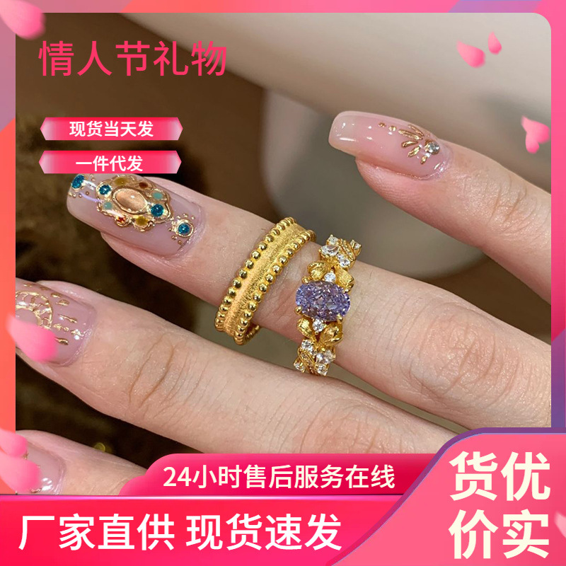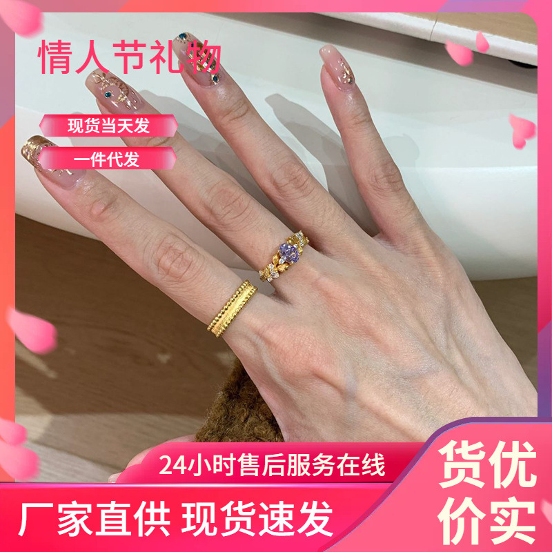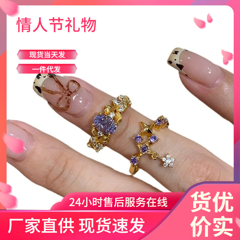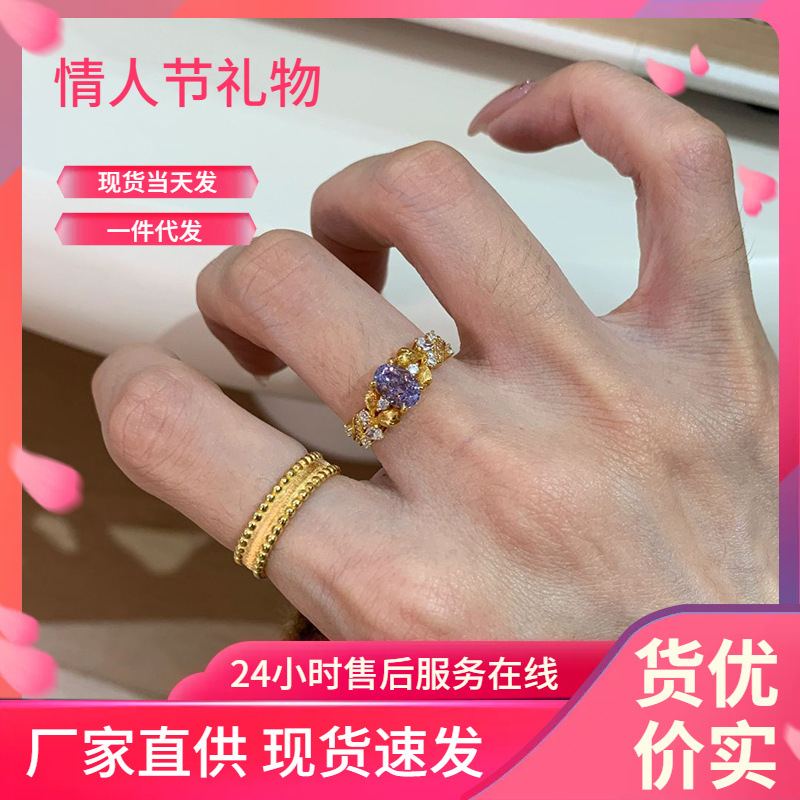 抖音爆款紫荆花闪钻戒指女仙气紫色宝石镶嵌轻奢指环一件代发