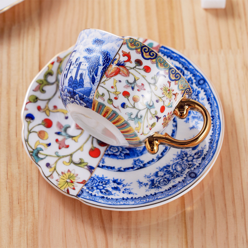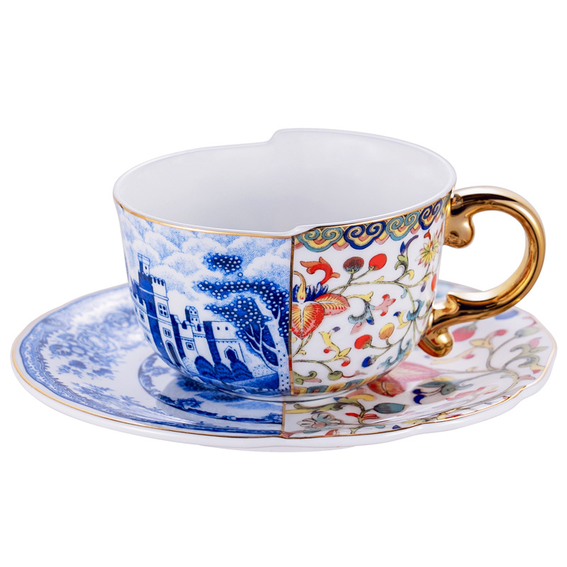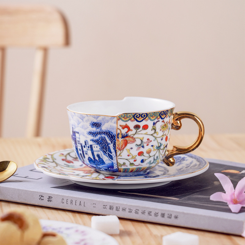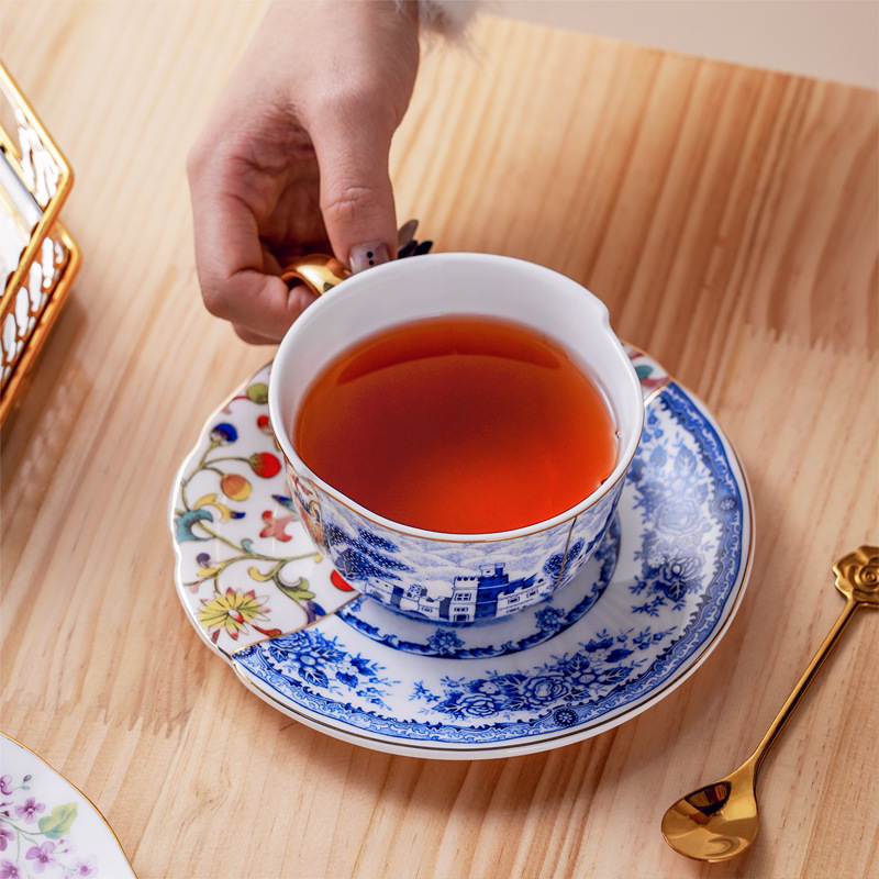 高骨瓷复古轻奢新中式不规则咖啡杯碟 斗彩青花陶瓷杯升级骨瓷杯