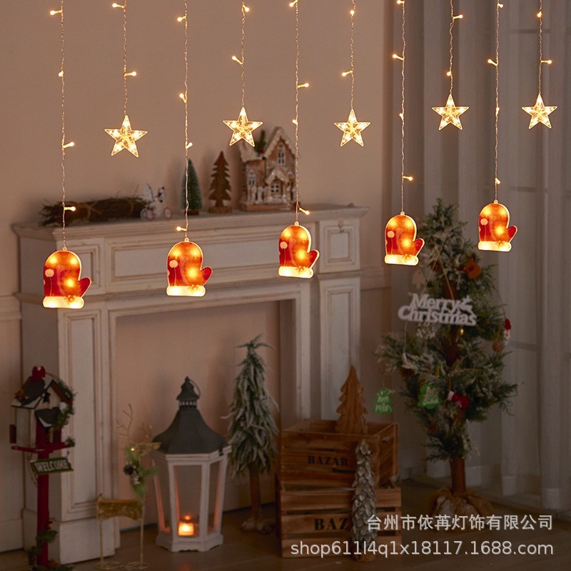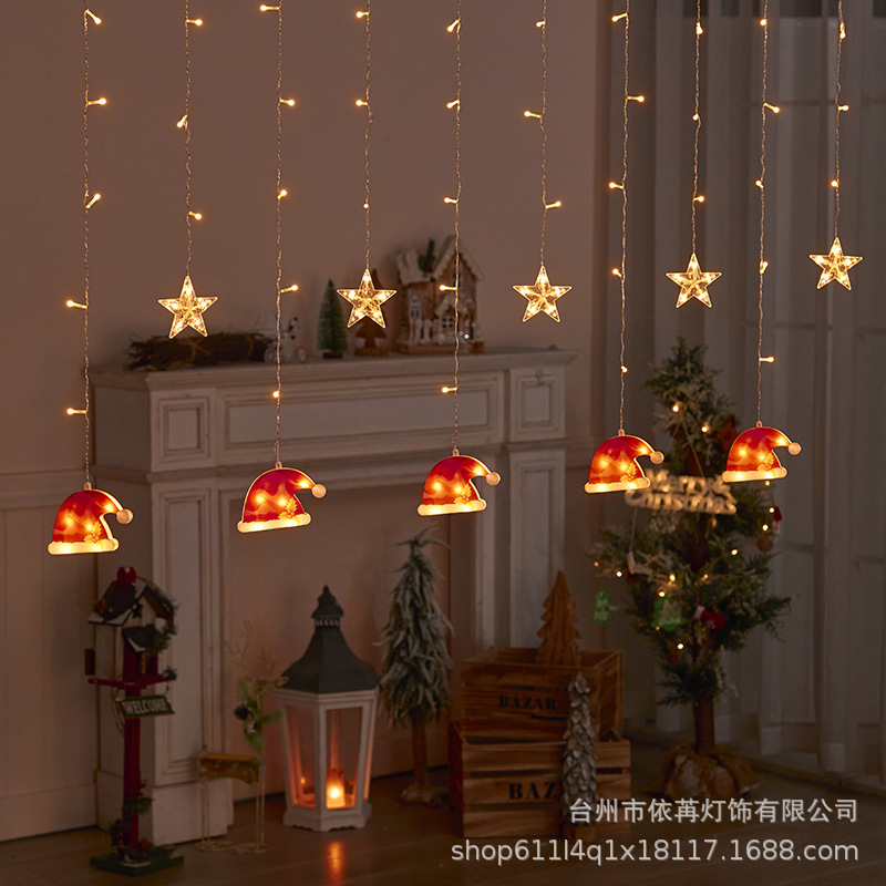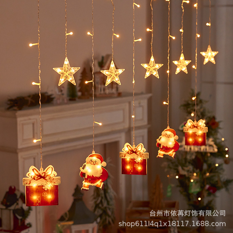 跨境led圣诞窗帘灯串老人星星装饰灯圣诞礼包彩灯房间氛围窗帘灯