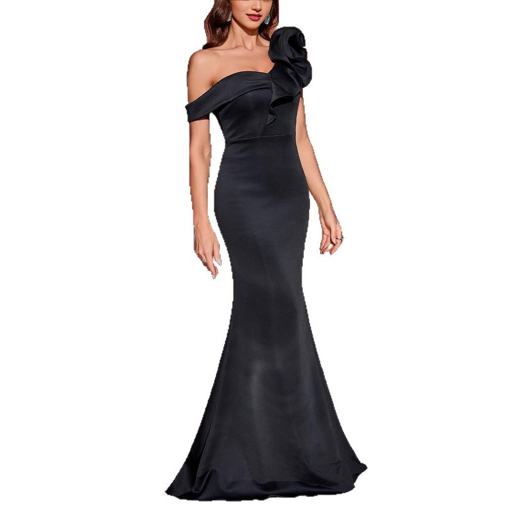 一字肩黑色礼服2025新款荷叶边短袖修身晚宴派对小黑裙跨境专供