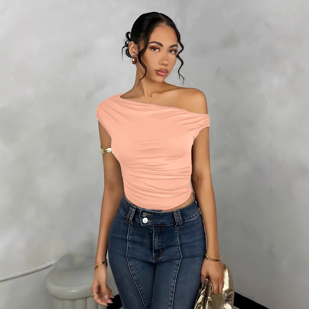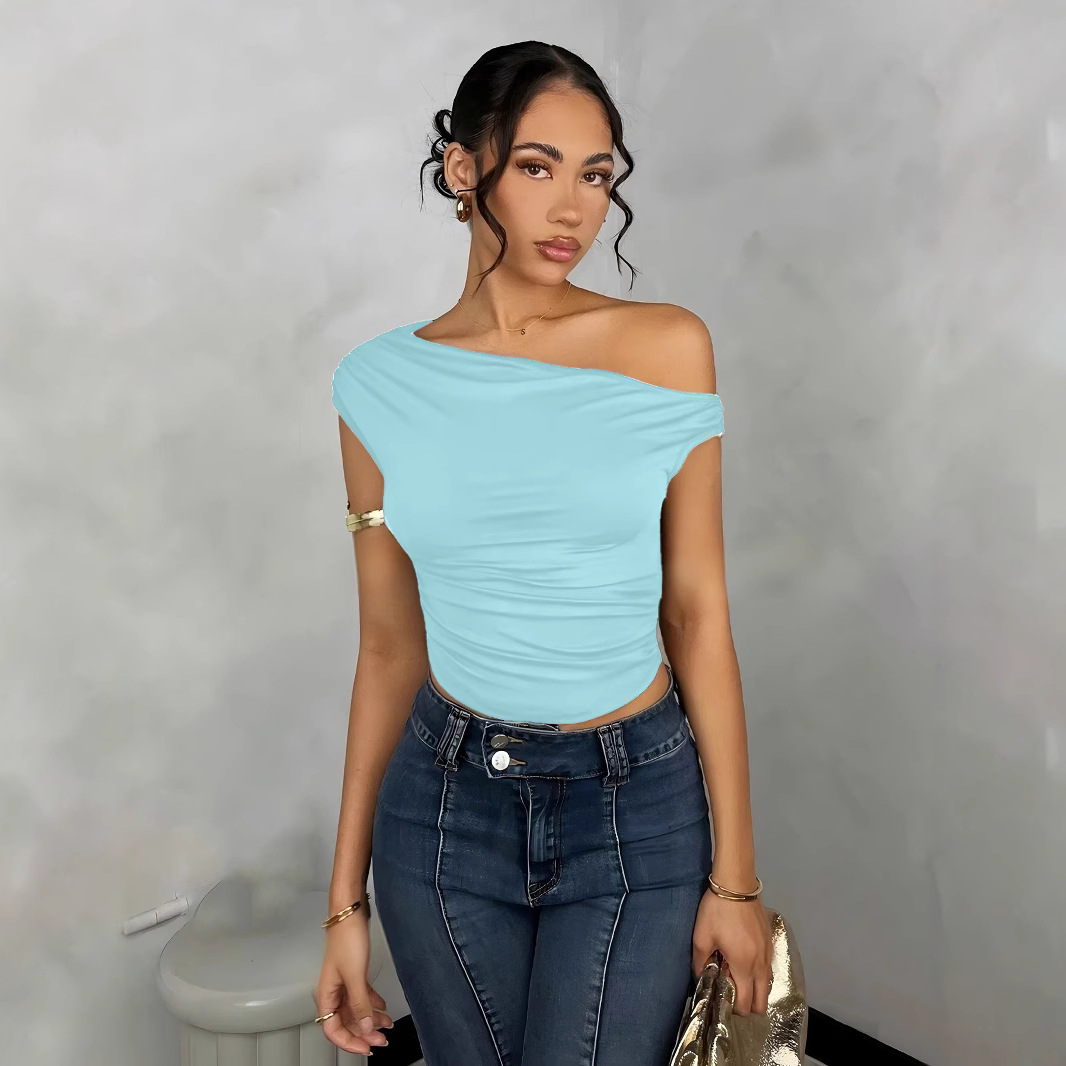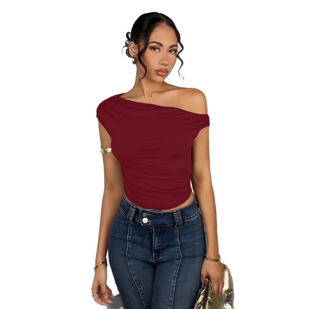 跨境纯色女式荷叶边短袖不对称肩夏季上衣