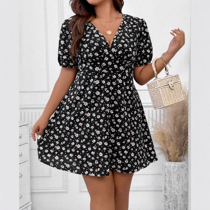 欧美女士大码休闲收腰灯笼短袖连衣裙波西米亚V领宽松小碎花裙子