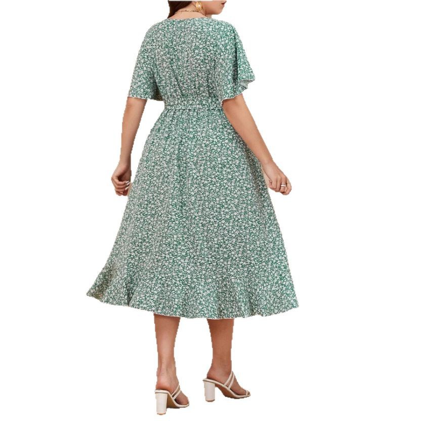 欧美女士大码V领不规则高腰系带印花连衣裙波西米亚中长款A字裙