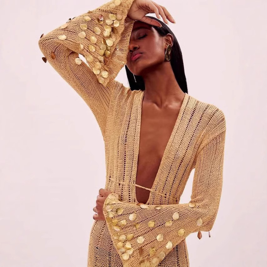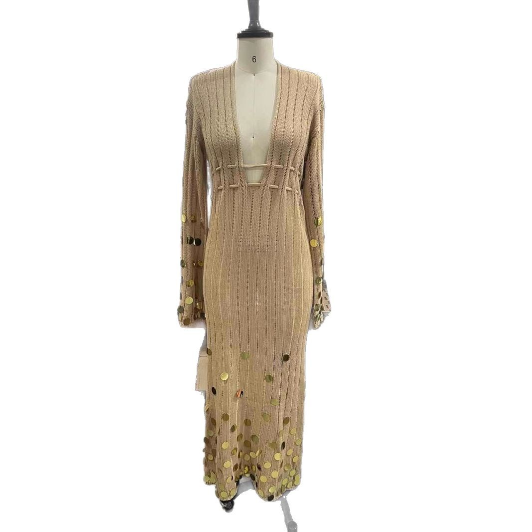 2025年春夏跨境外贸新款气质V领亮片喇叭袖针织长裙