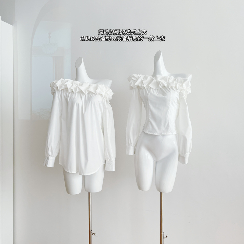 纯白布拉格 白色法式一字肩衬衫女春秋设计感露肩长袖上衣