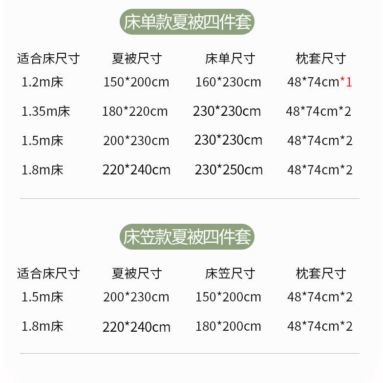 尺寸规格 | 220X240cm【夏被+枕套一对】 | 尺寸规格 | 150X200cm【夏被+床单+枕套一对】 |