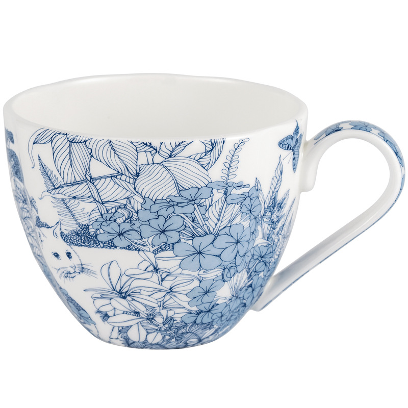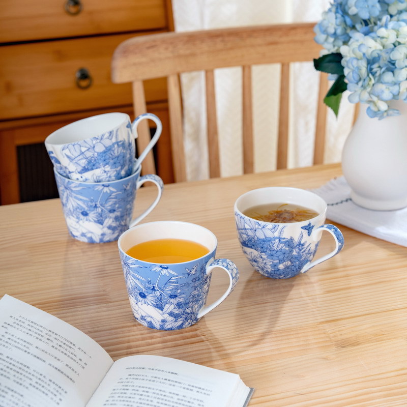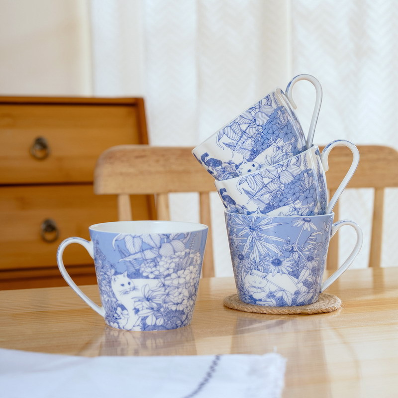小清新田园风花瓣形陶瓷杯 可爱青花猫咪高骨瓷水杯马克杯四件套