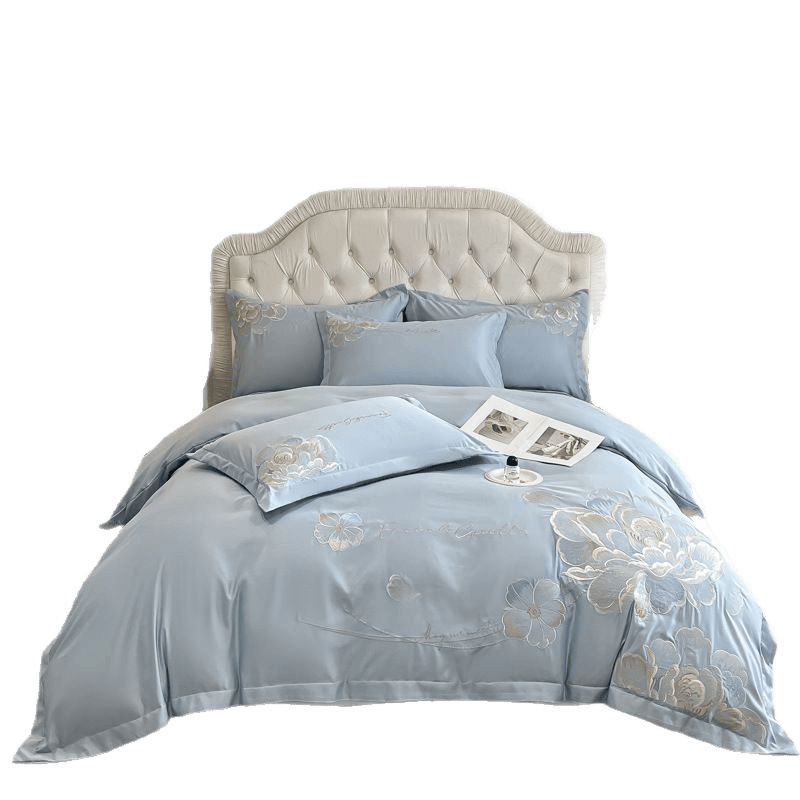 水星家纺类水洗真丝四件套简约刺绣被套床单双人宿舍床笠1.8套件