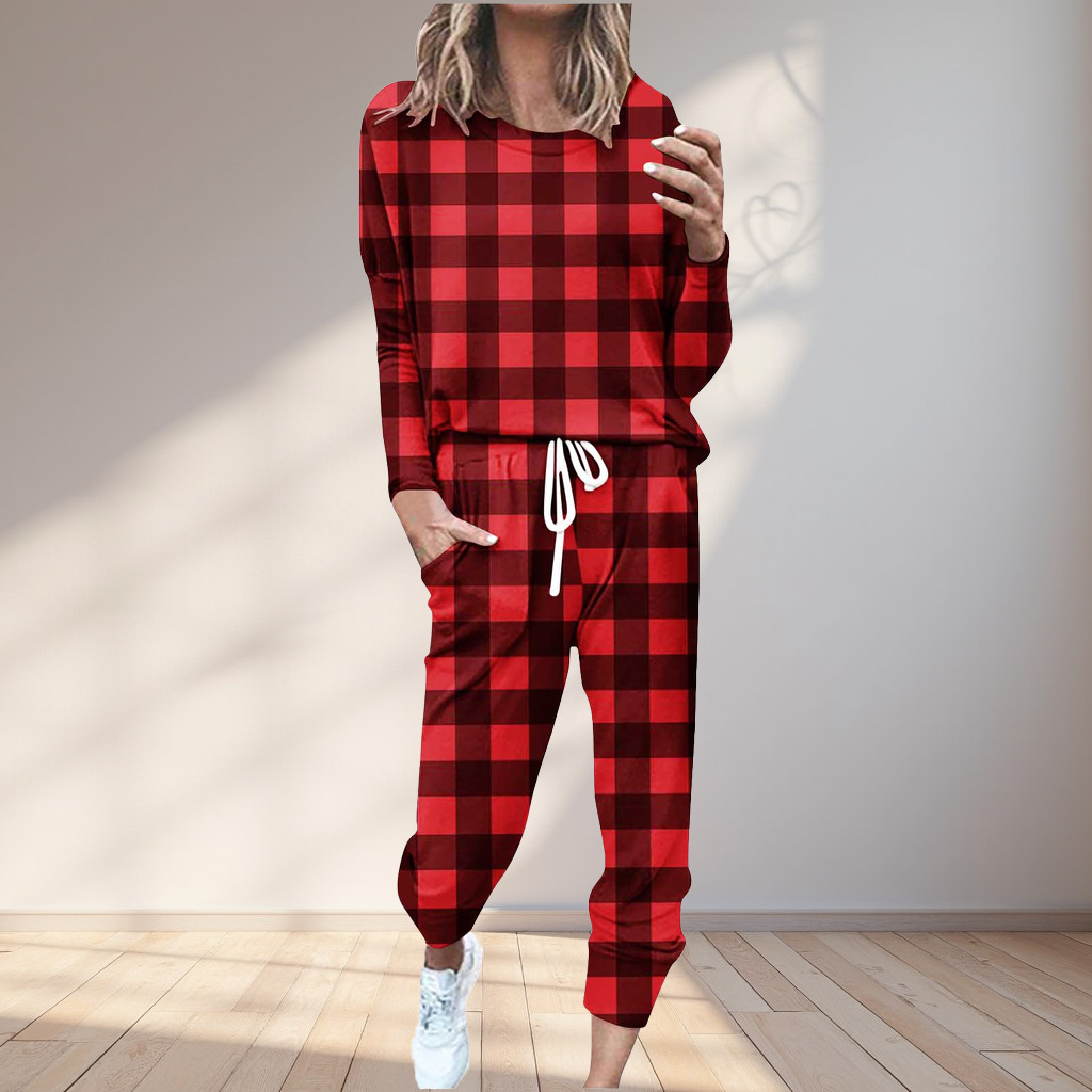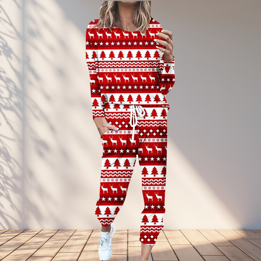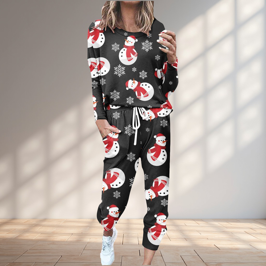 亚马逊跨境欧美女装休闲圣诞节印花长袖长裤睡衣休闲运动套装定制