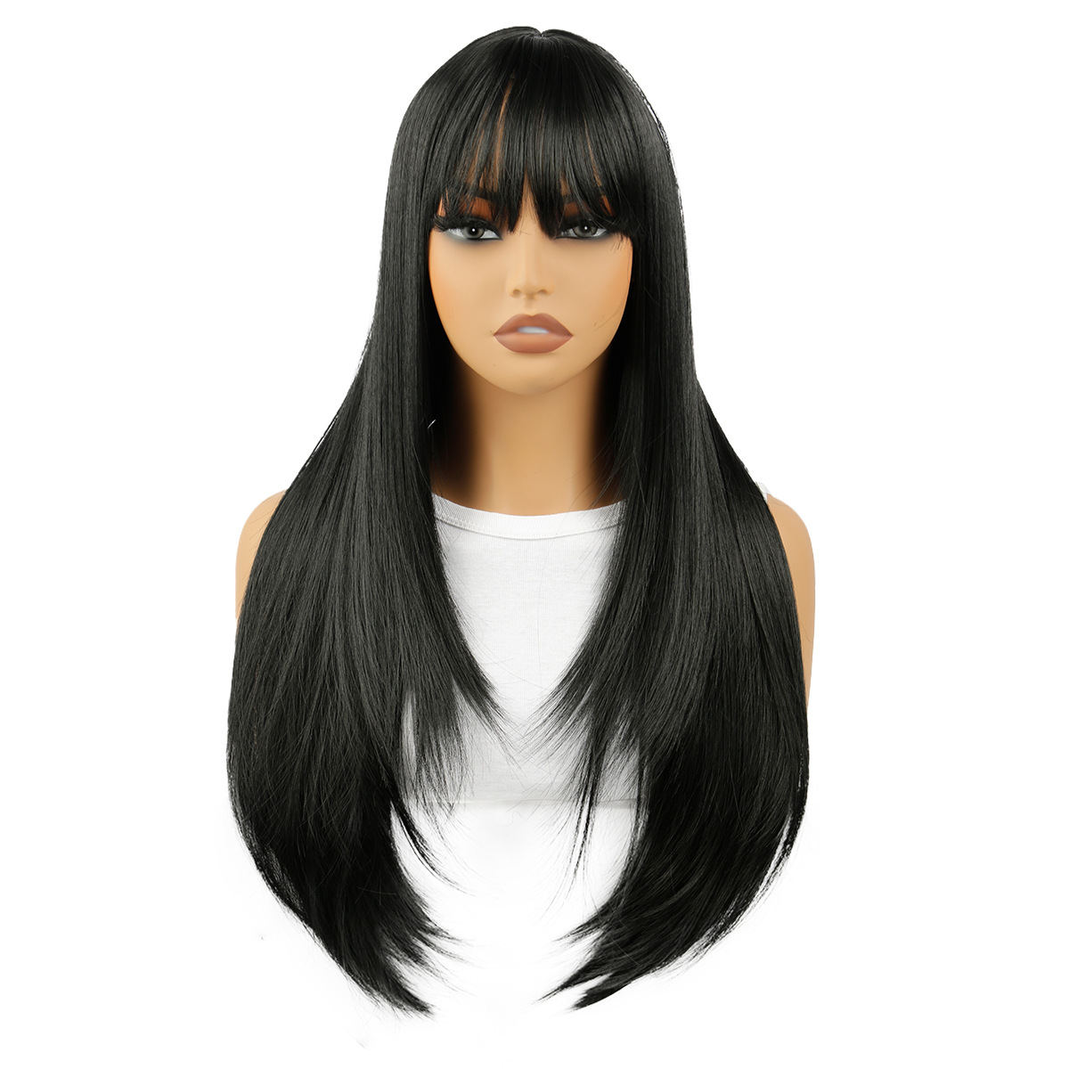跨境欧美自然黑齐刘海长直发假发女外贸热销化纤全头套厂家批发
