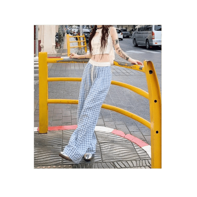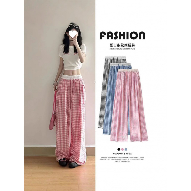 夏季薄款粉色格子阔腿裤女新款高腰垂感宽松慵懒感休闲拖地裤