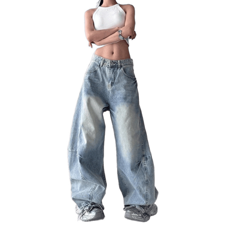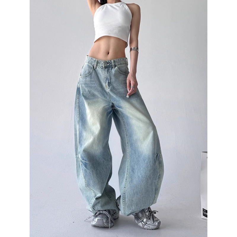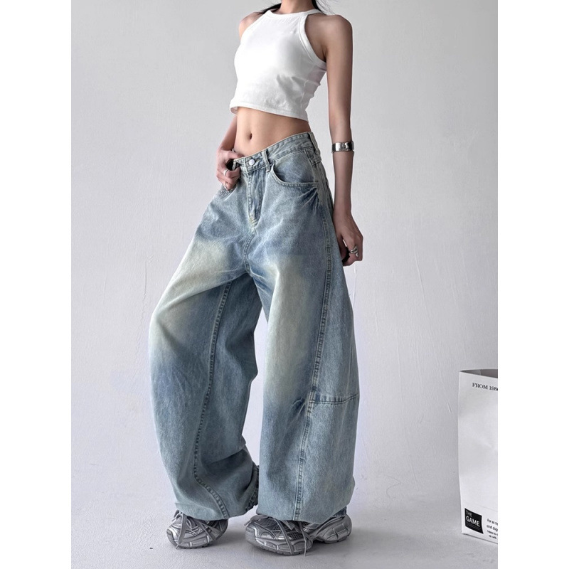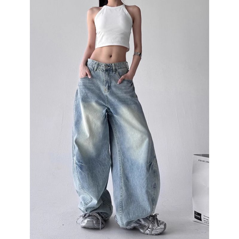 美式复古嘻哈街头水洗浅蓝弯刀牛仔裤女春夏新款宽松显瘦阔腿裤潮