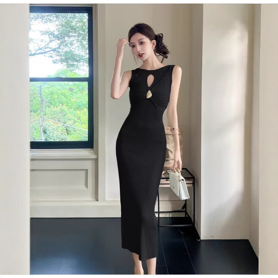 法式2005美风镂空扭结高腰包臀丝光棉气质长裙韩版夏季新款连衣裙