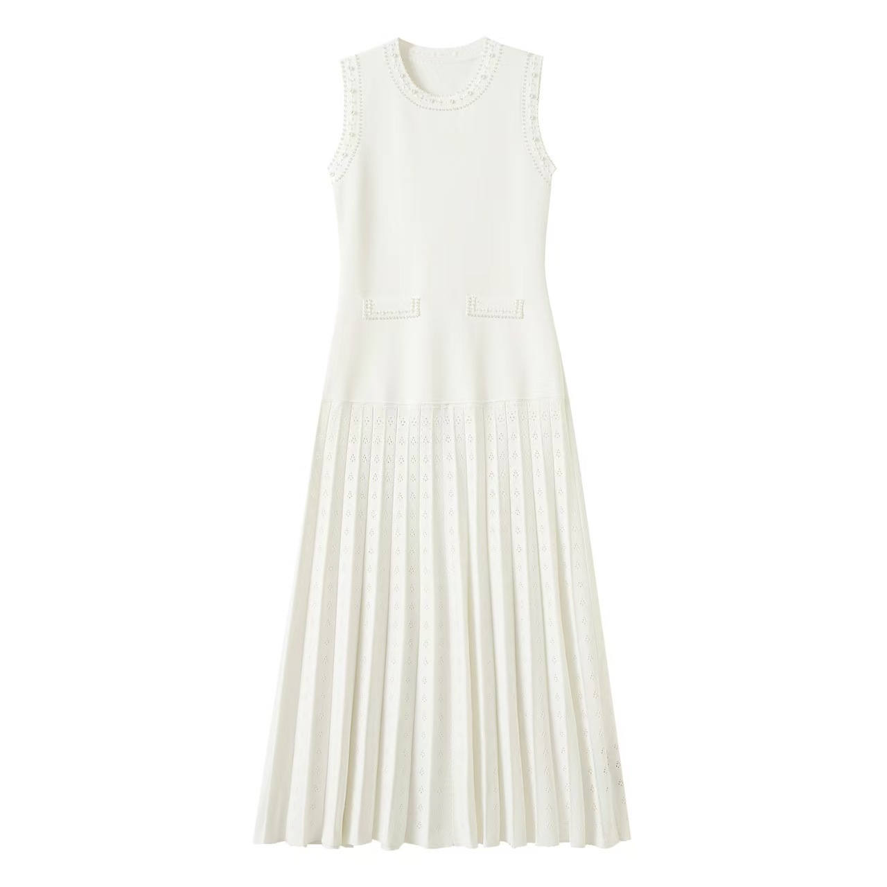 S家无袖裙春夏新款小香风镂空钉珠圆领修身气质针织重工长连衣裙