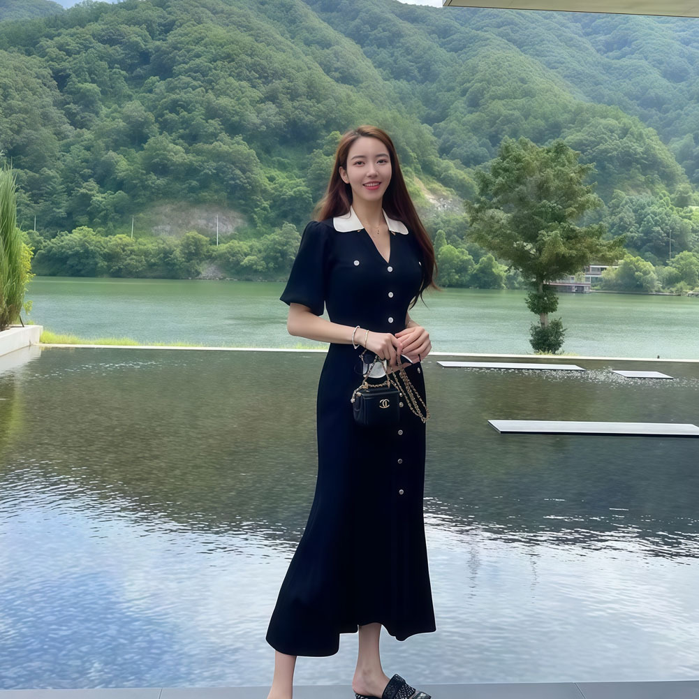 欧美 法式时尚V领单排扣泡泡袖开叉鱼尾长裙夏季款冰丝短袖连衣裙