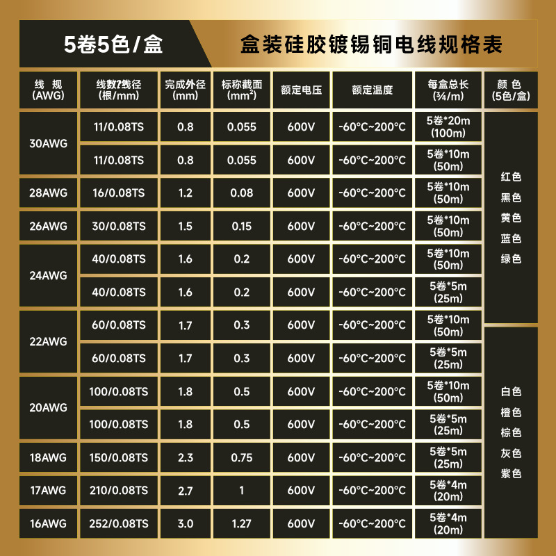 产品型号5卷/盒装硅胶电线